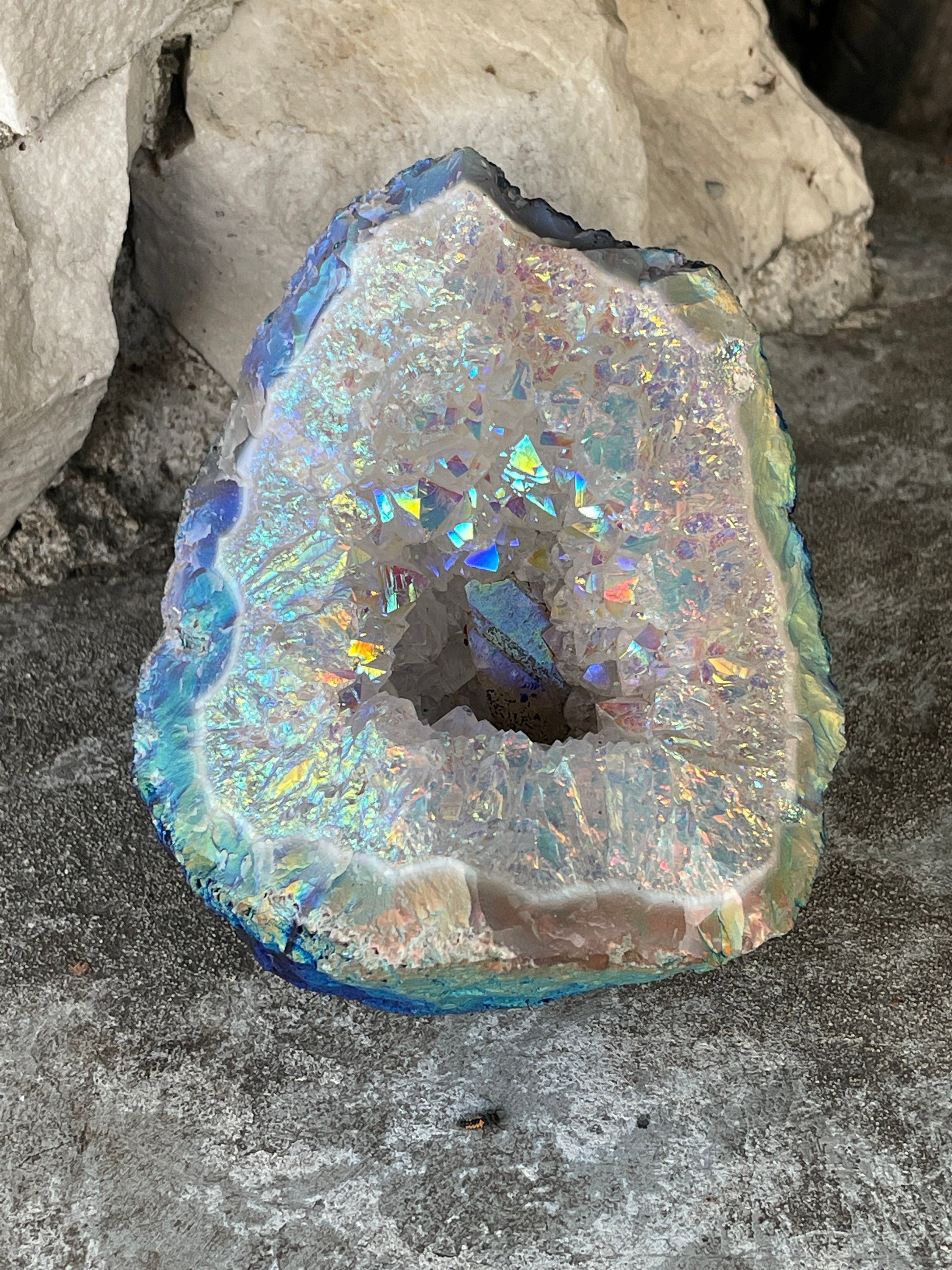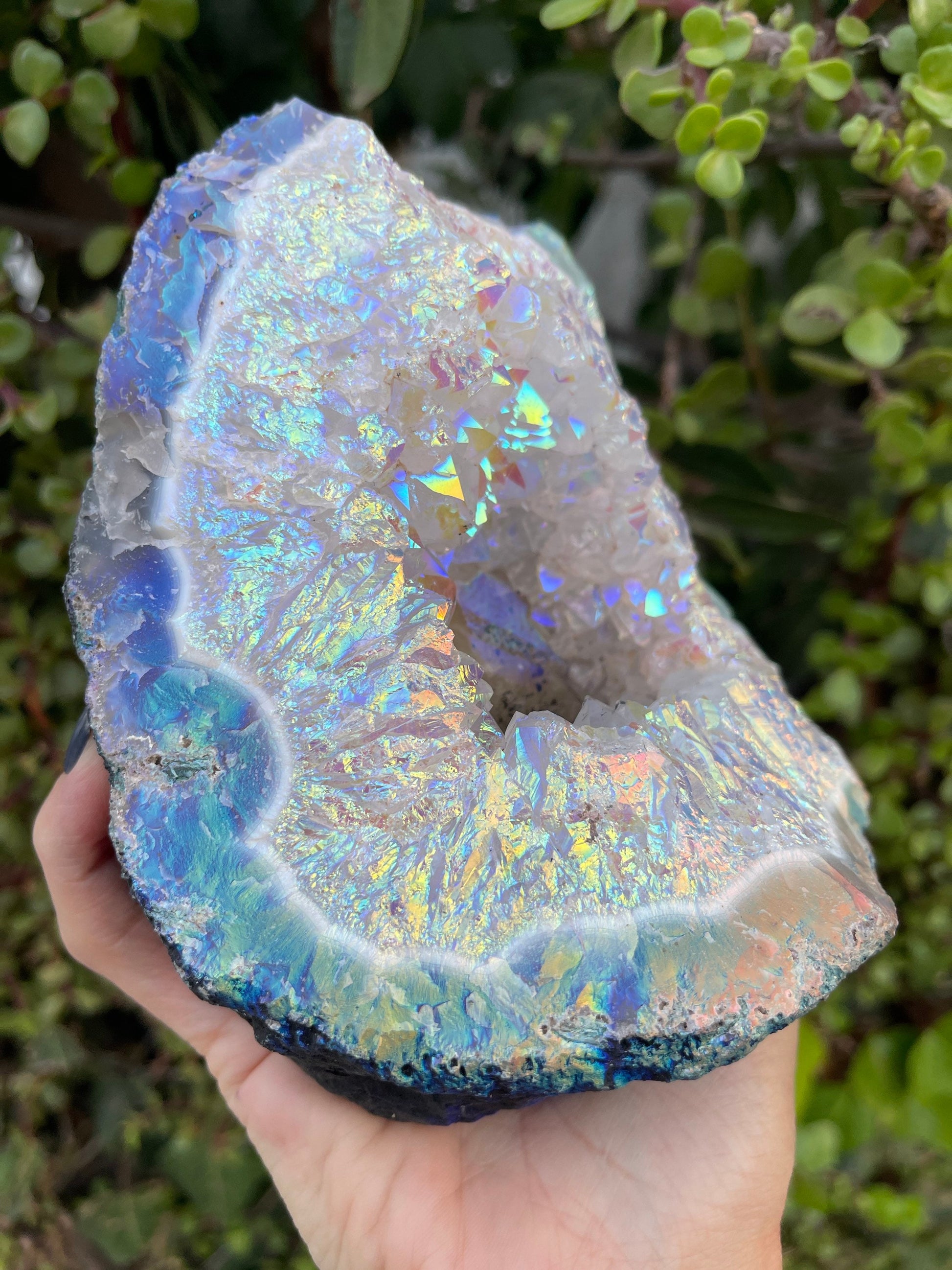 Surround yourself with white light, love, beauty and great energy with this extra special Angel Aura coated Amethyst cluster. This gorgeous geode is self standing. This piece is a magical, metallic mix of rainbow colors in which the faceted crystal points shimmer and change color as they move and send light in different angles. I am so in love with this piece and the wonderful energy it holds. Amethyst is a stone of spiritual protection and purification. It is a Wind element stone that stimulates the mind, the intuitive and psychic abilities. It facilitates meditation and helps connect us to the spiritual realms. It opens and clears the Third Eye & Crown Chakras. It has traditionally been used to counter addictive behavior and thought patterns. Amethyst has been placed in a chamber in which Platinum, Silver and other metal oxides are introduced in vaporized form and caused to bond with the Amethyst. The result is simply stunning! Amethyst that displays multi colored reflections and according to Metaphysical sources it, radiates a significantly different energy from untreated Amethyst. Energetically, it has a loving and sweet energy that helps elevate one’s mood and stimulate the spirit. It will fill you with joy and optimism. It is prized for it’s ability to expand one’s consciousness and help to perceive & receive information from the angel guides. These properties are amplified by the Amethyst.