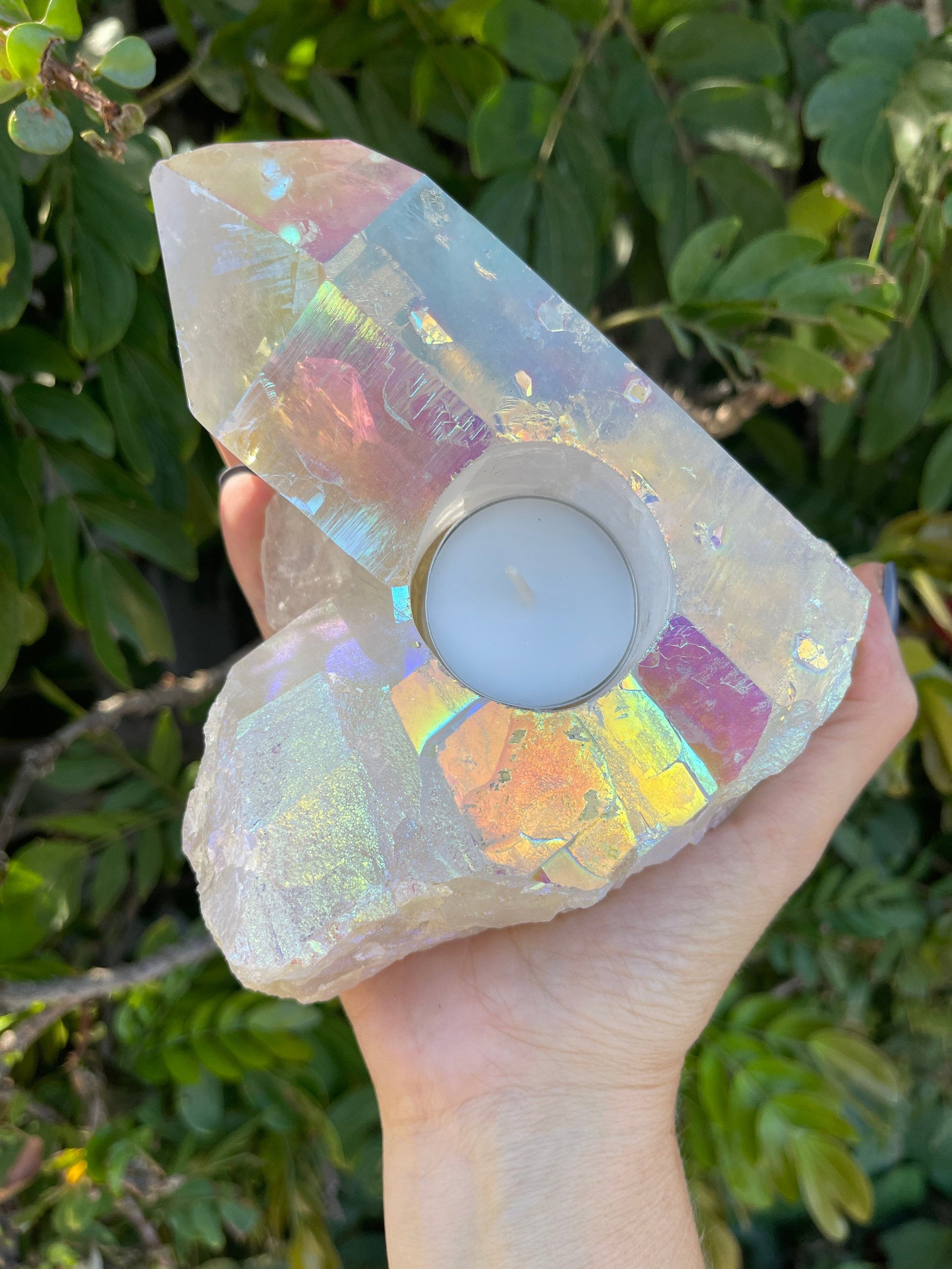 Surround yourself with white light, love, amazing energy & beauty with this extra special Angel Aura coated, raw Quartz crystal tealight candle holder. This gorgeous piece is a magical, ethereal mix of colors in which the crystal shimmers and changes color as it moves and sends light in different angles.