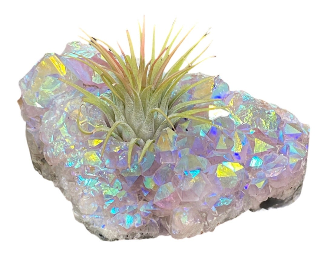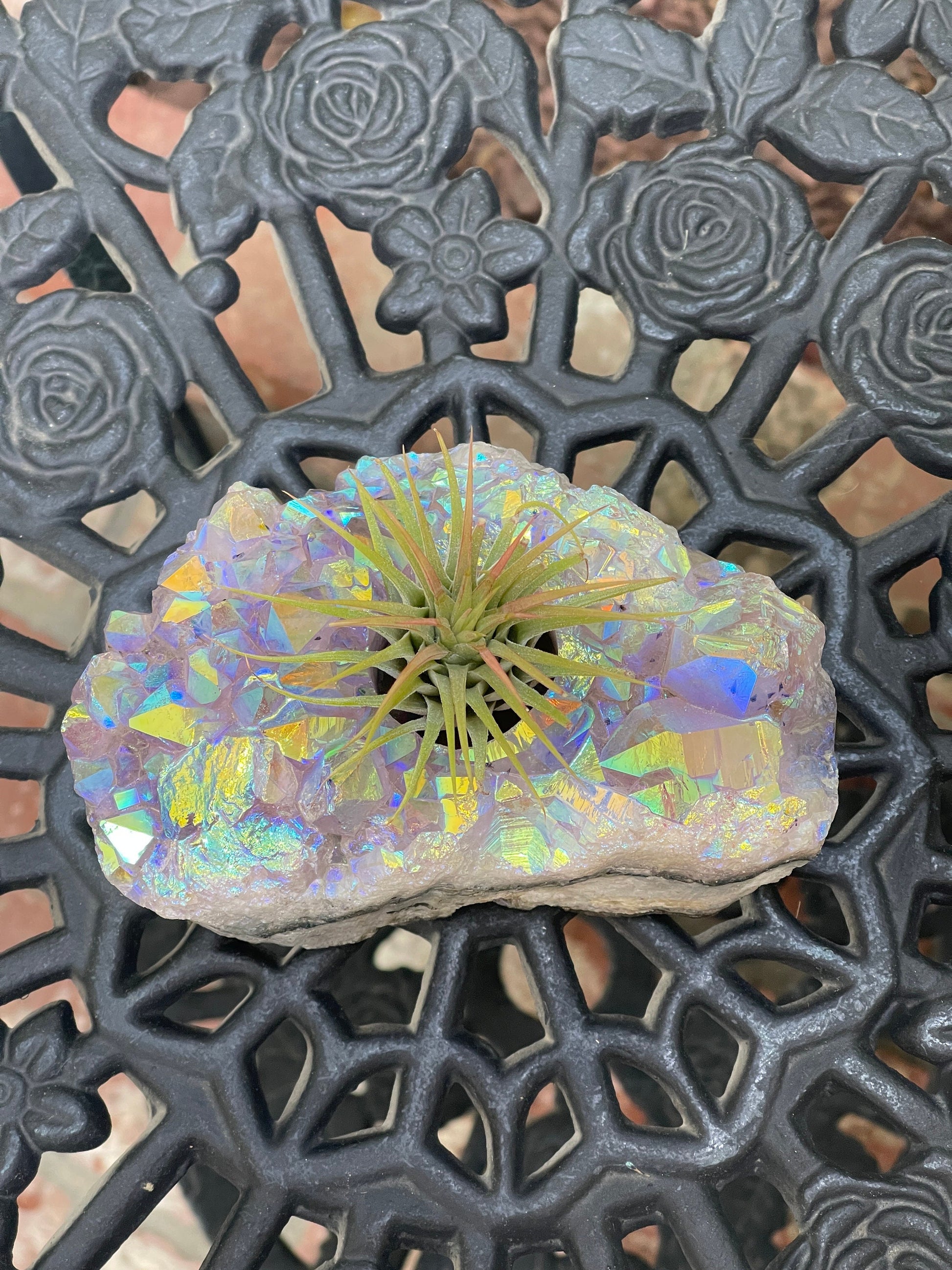 Illuminate your space with beauty and great energy with this special angel aura coated Amethyst airplant or sphere holder. This piece has a hole that is too small for a tea light & a bit to large for a taper candle.