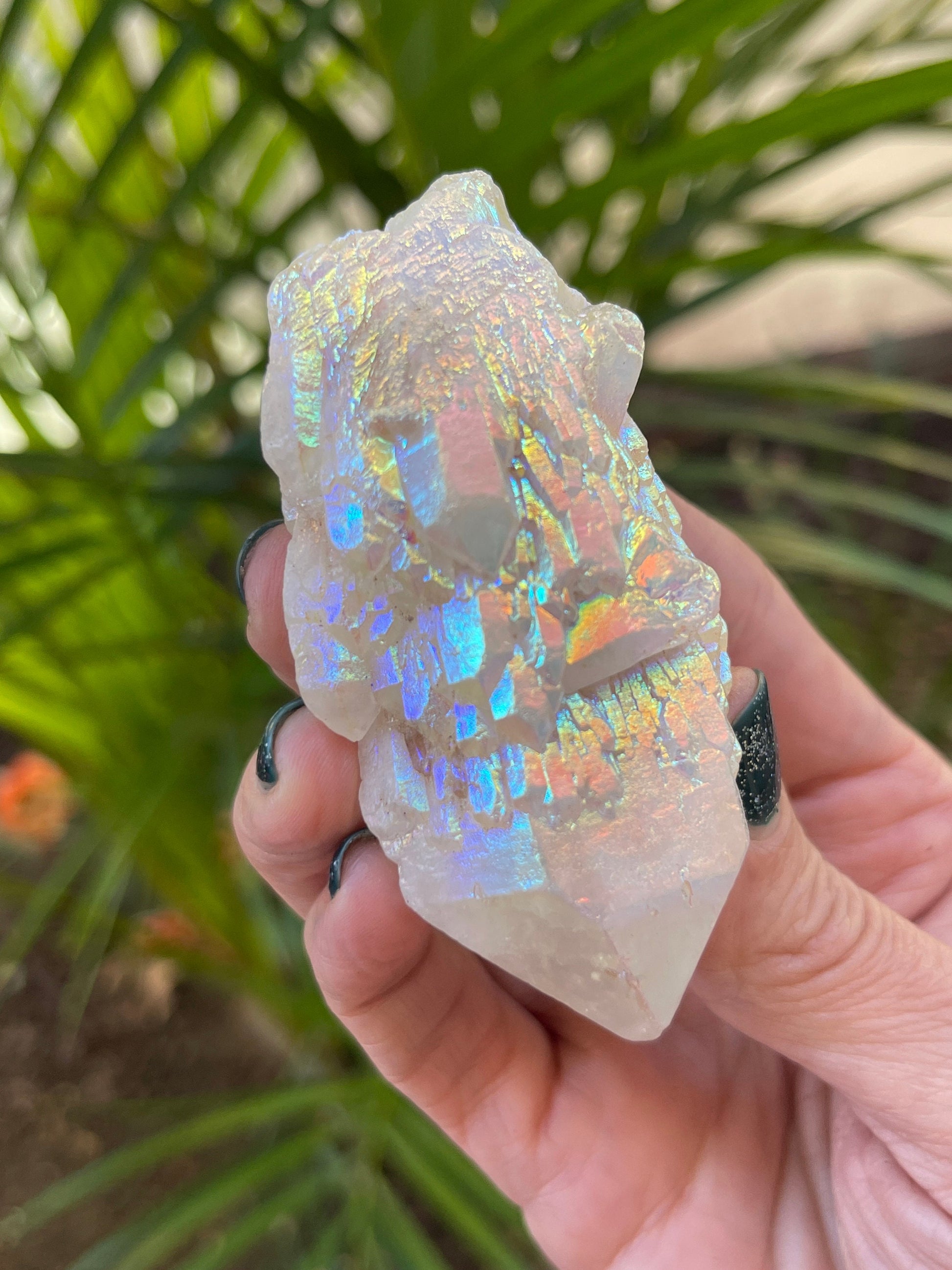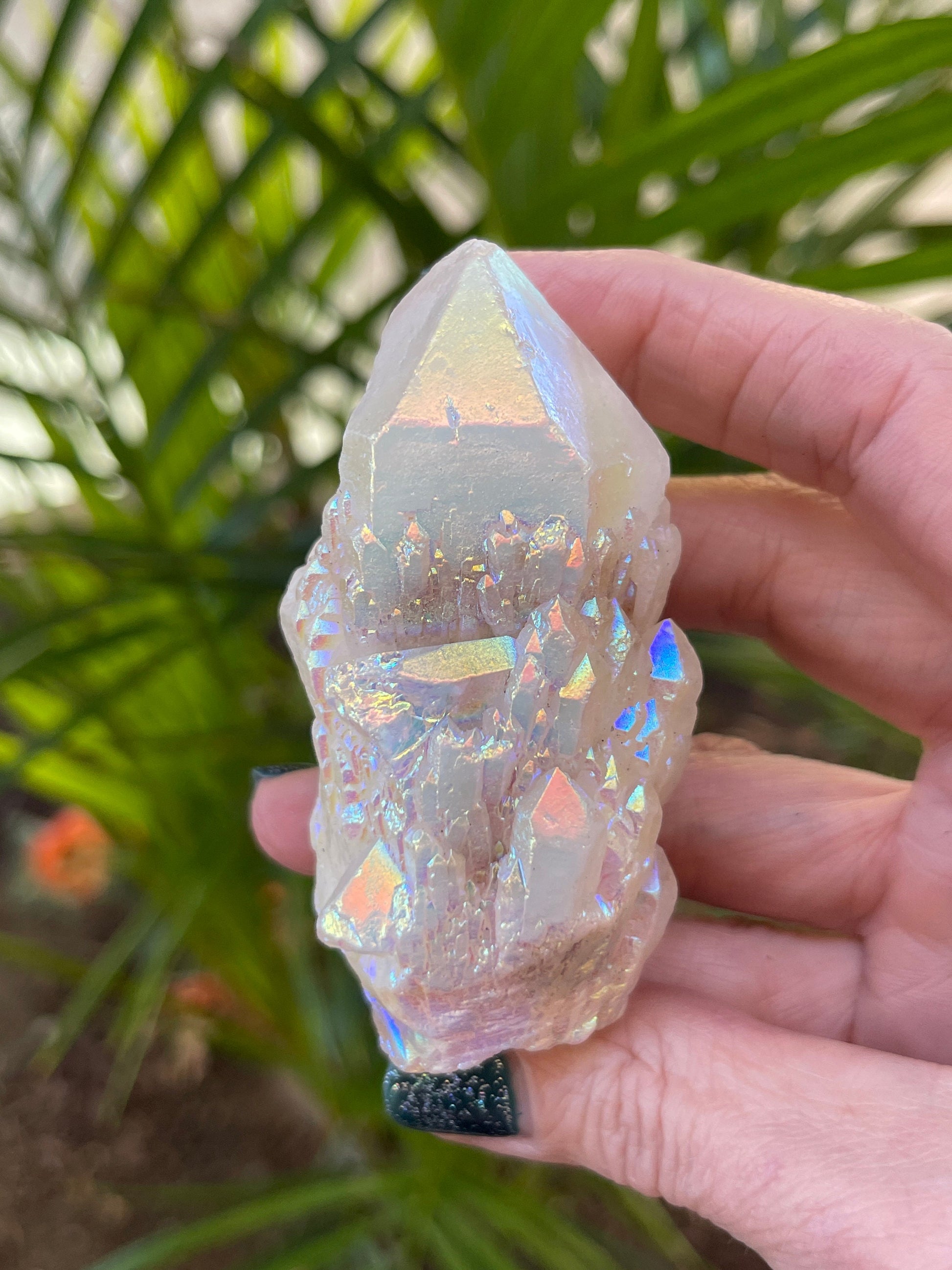 Illuminate your vibration with the beauty & joyful energy with this Angel Aura coated, candle Quartz point. This gorgeous piece is a magical, ethereal mix of colors in which the crystal shimmers and changes color as it moves and sends light in different angles.