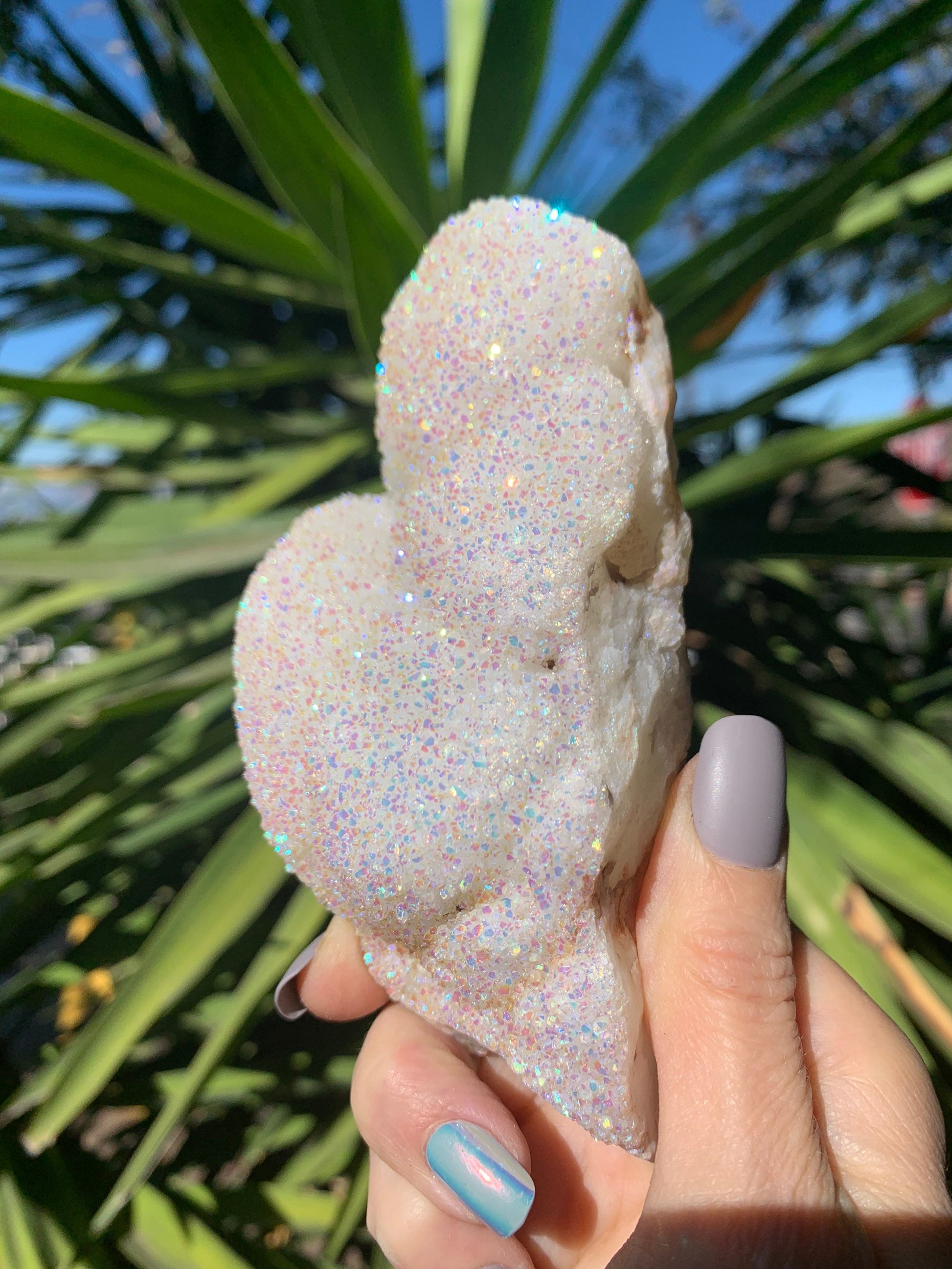 Surround yourself with white light, love, amazing energy & beauty with this extra special Angel Aura coated, raw Quartz Druzy crystal. This sparkly druzy beauty reminds me of a mitten!