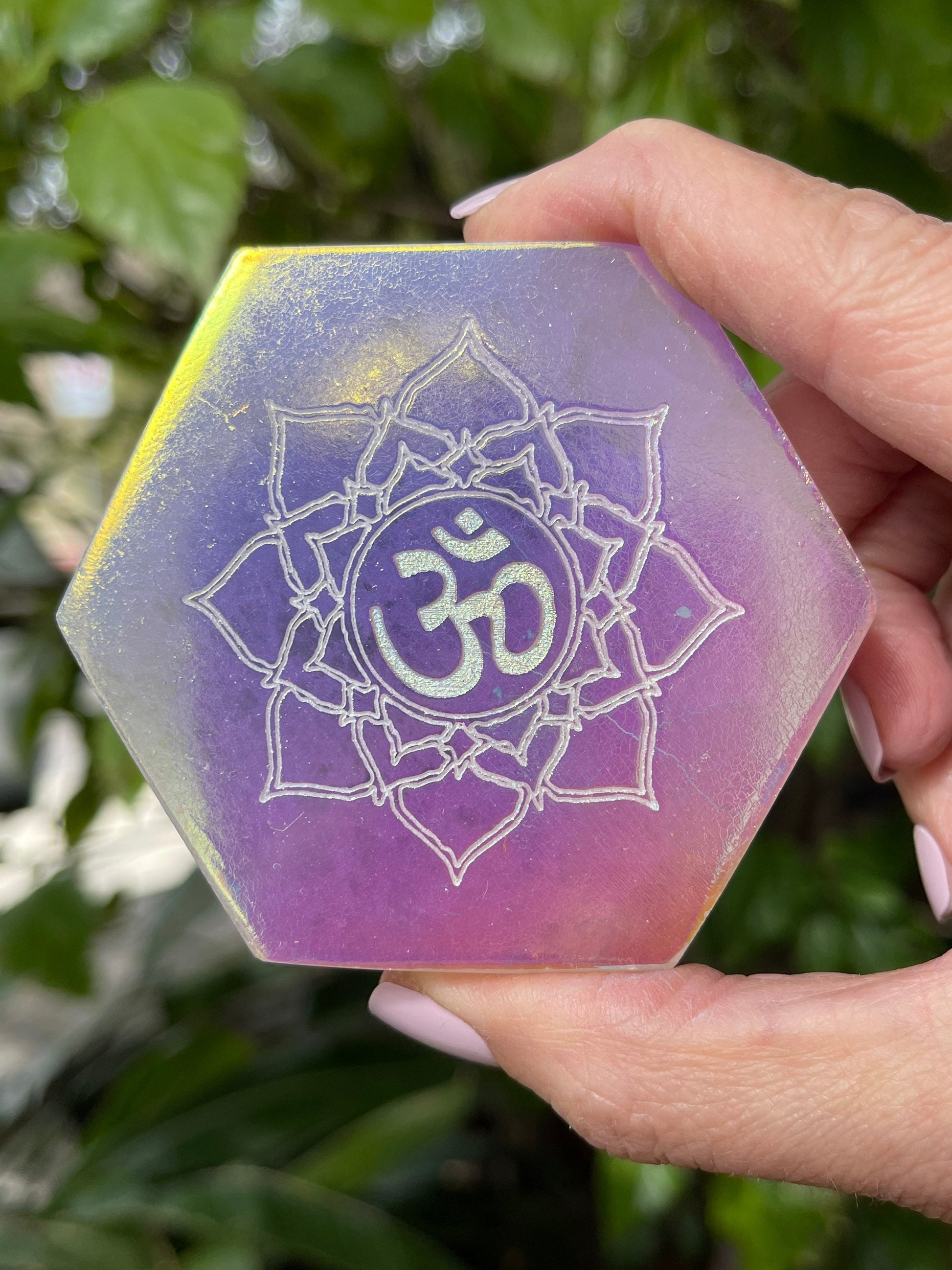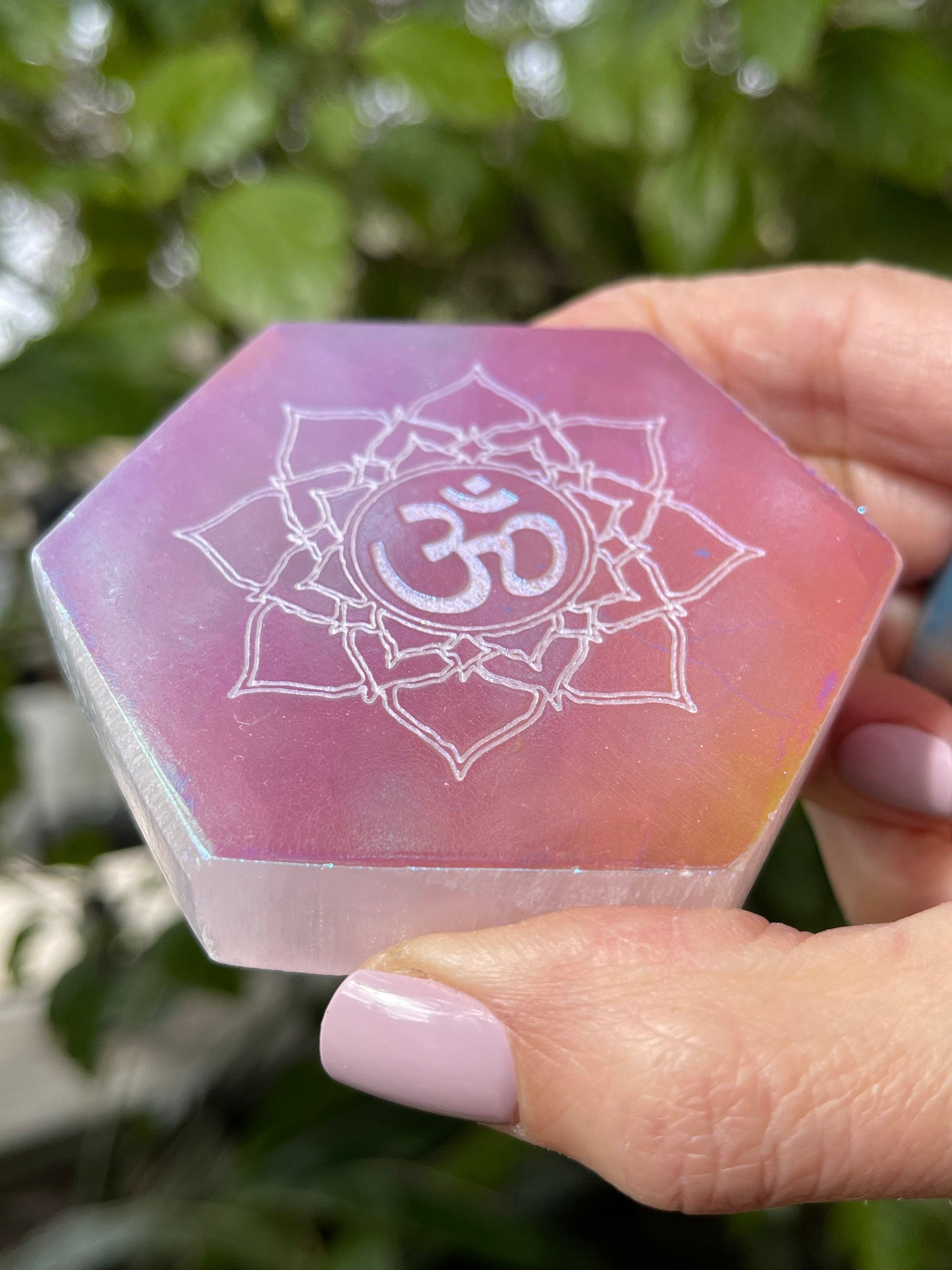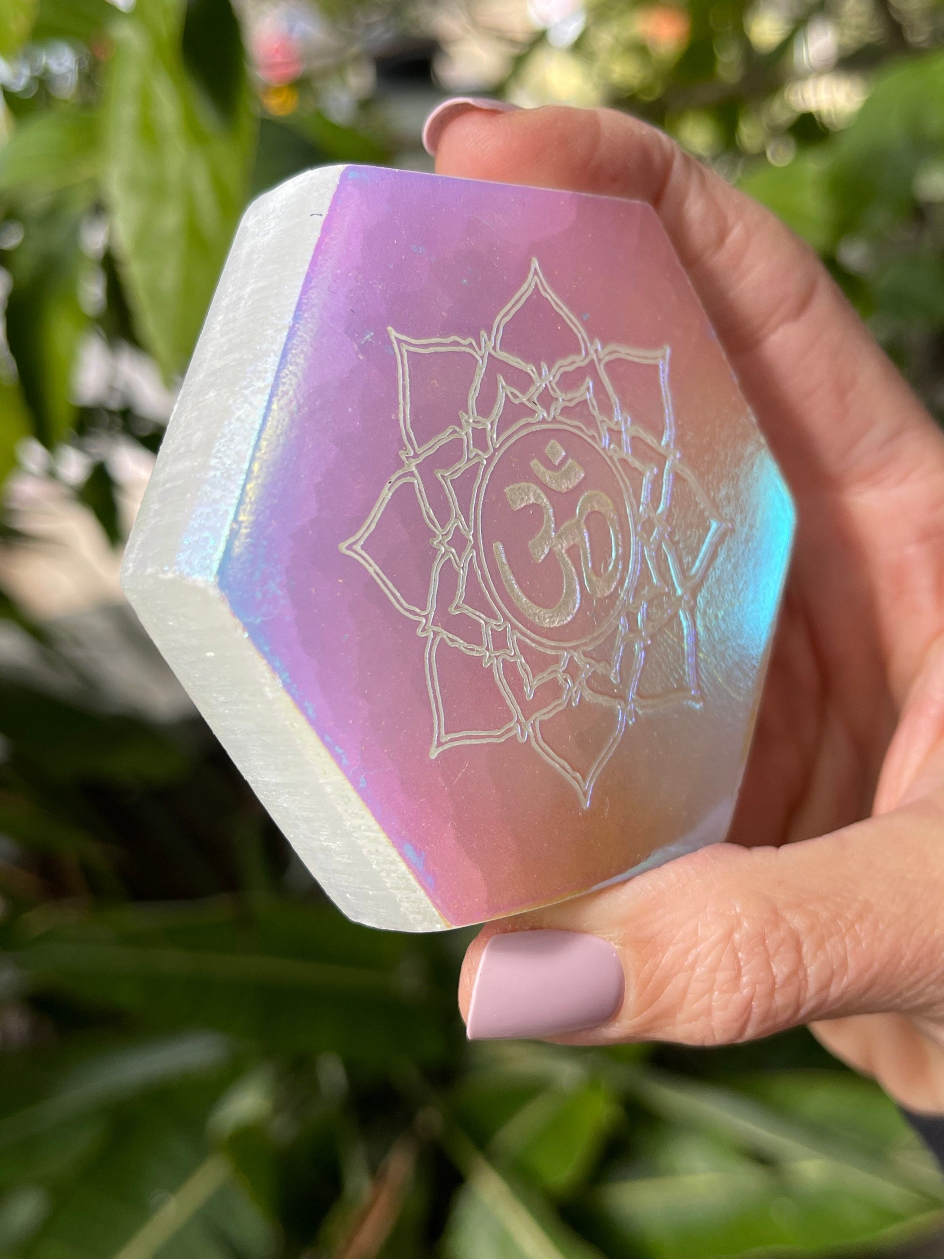 Angel Aura Om Selenite Hexagon, Etched Selenite Om Mandala, Sacred Geometry, Sacred Space, Altar, Metaphysical, Energy Clearing