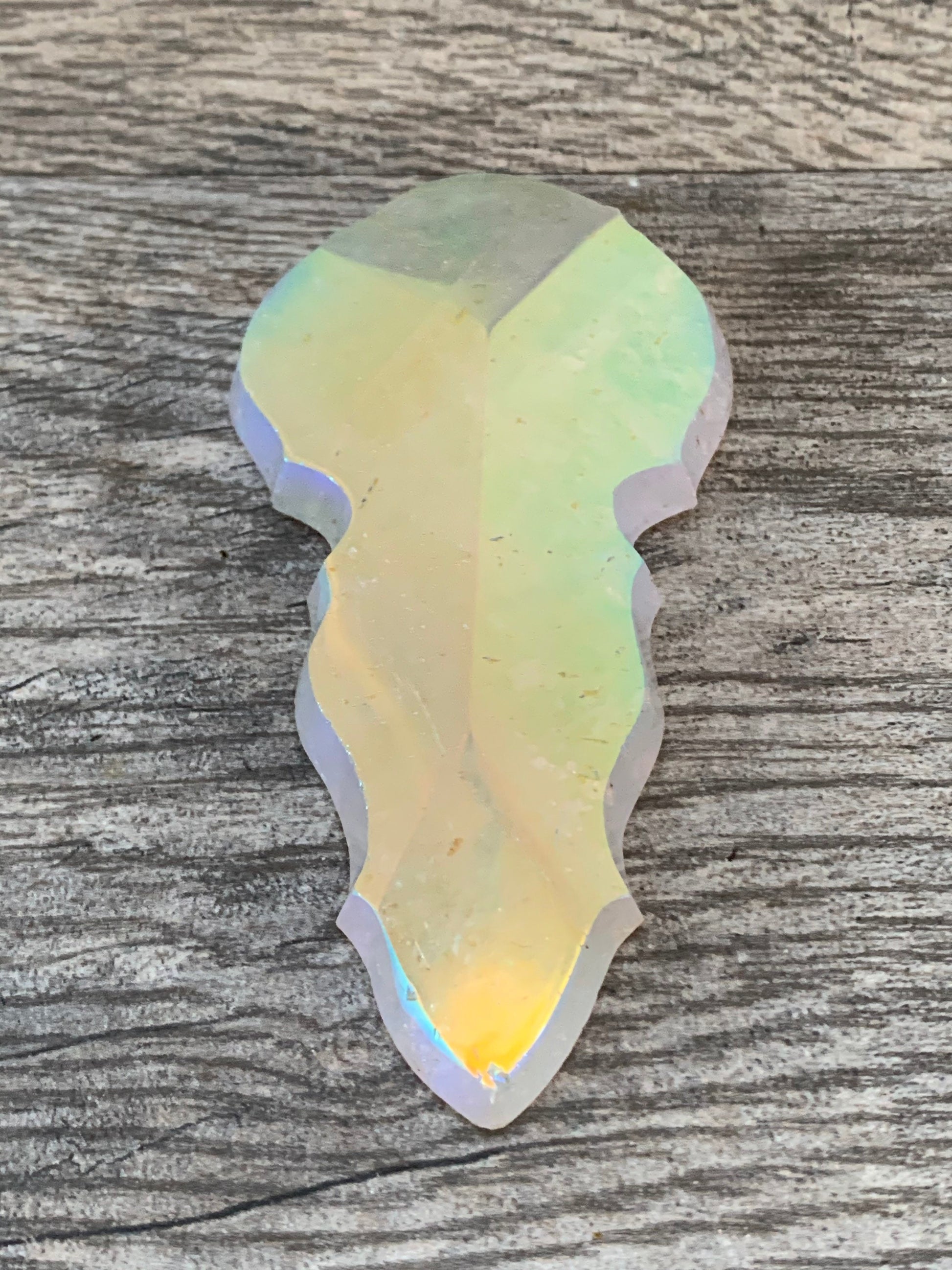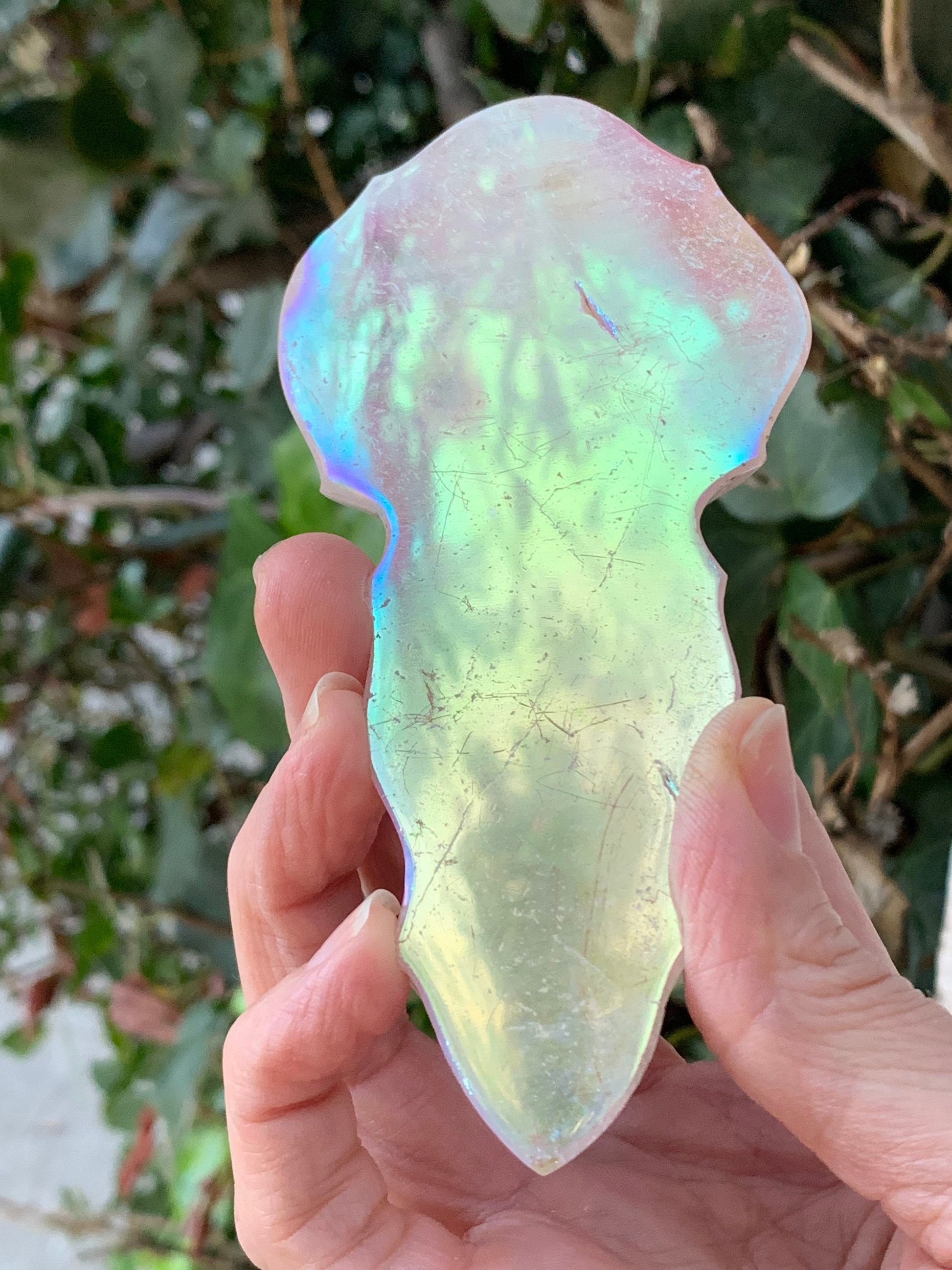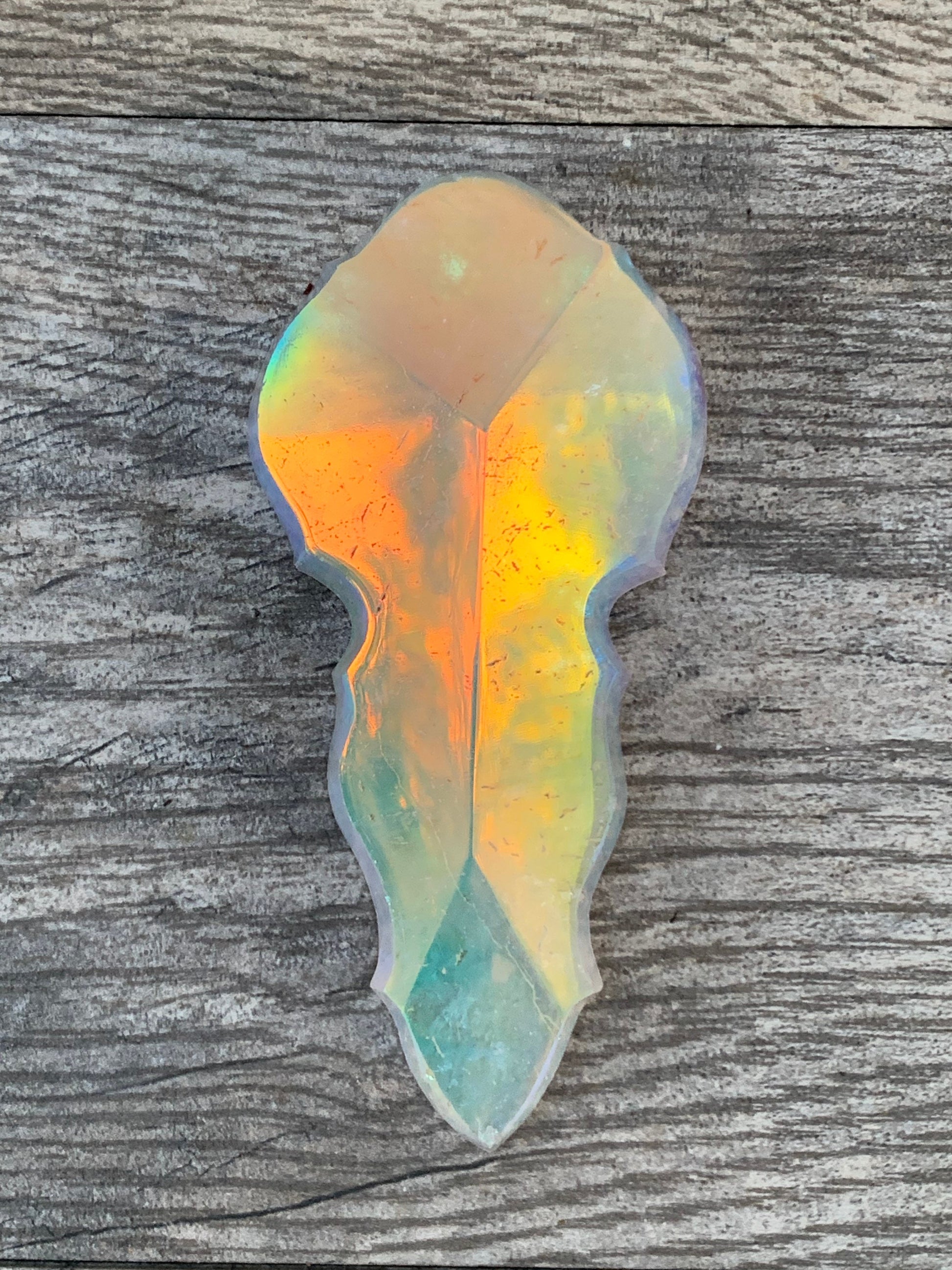 This piece is a magical, etherial mix of colors in which the crystal shimmers and changes color as it moves and sends light in different angles. Pictures don’t do it justice.