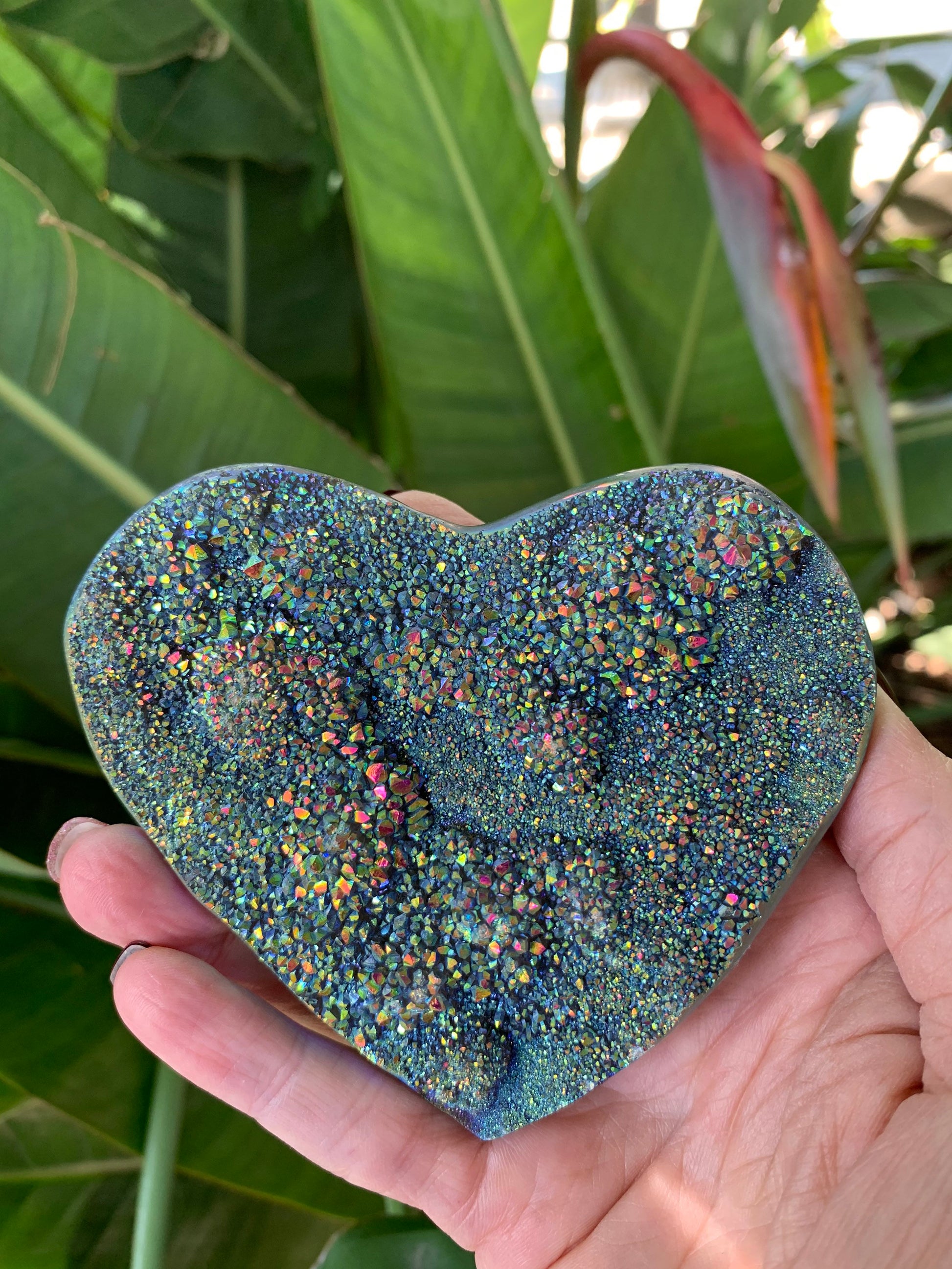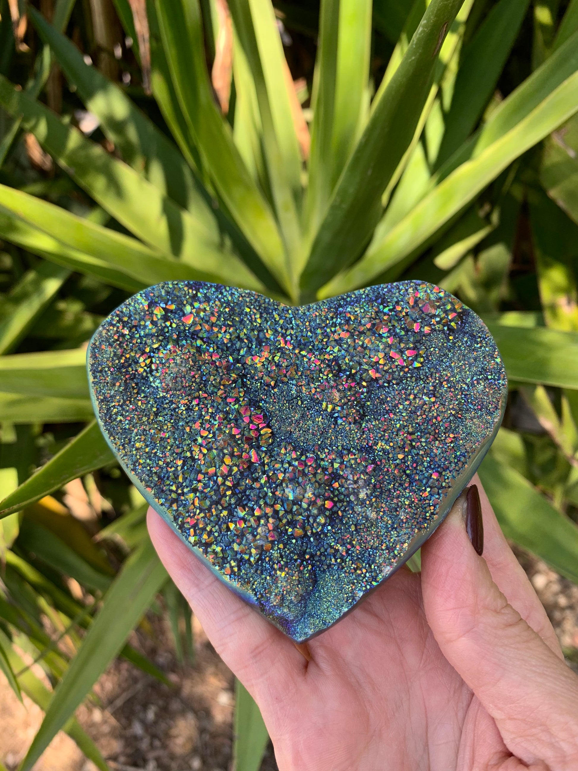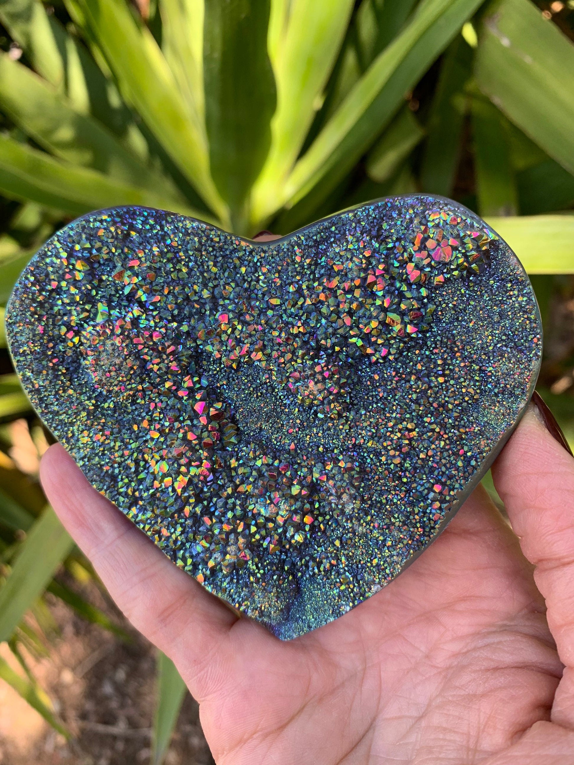 Surround yourself with white light, love, beauty and great energy with this extra special Titanium Aura coated Amethyst heart. This piece is a magical, metallic mix of rainbow colors in which the faceted crystal points shimmer and change color as they move and send light in different angles.