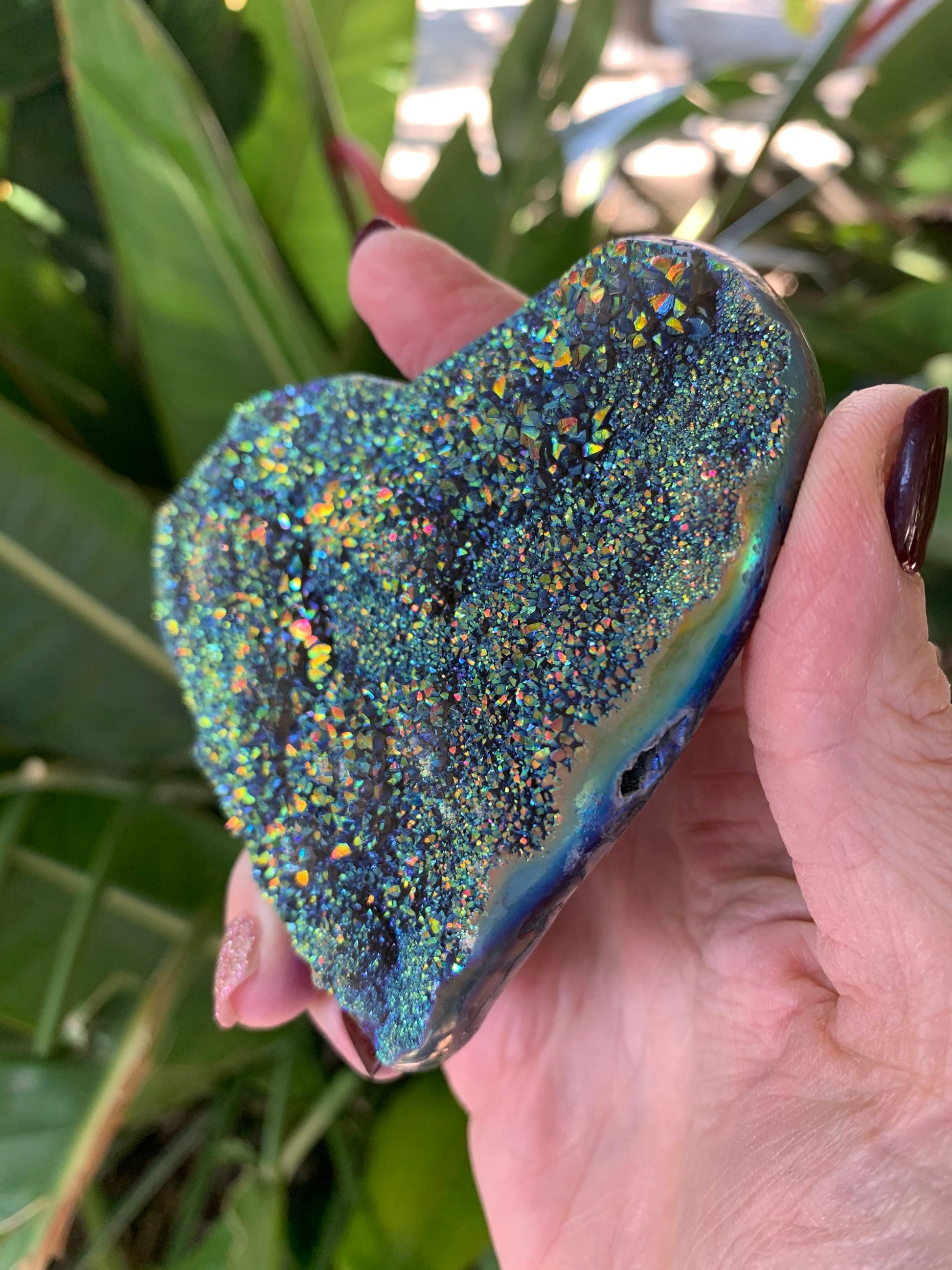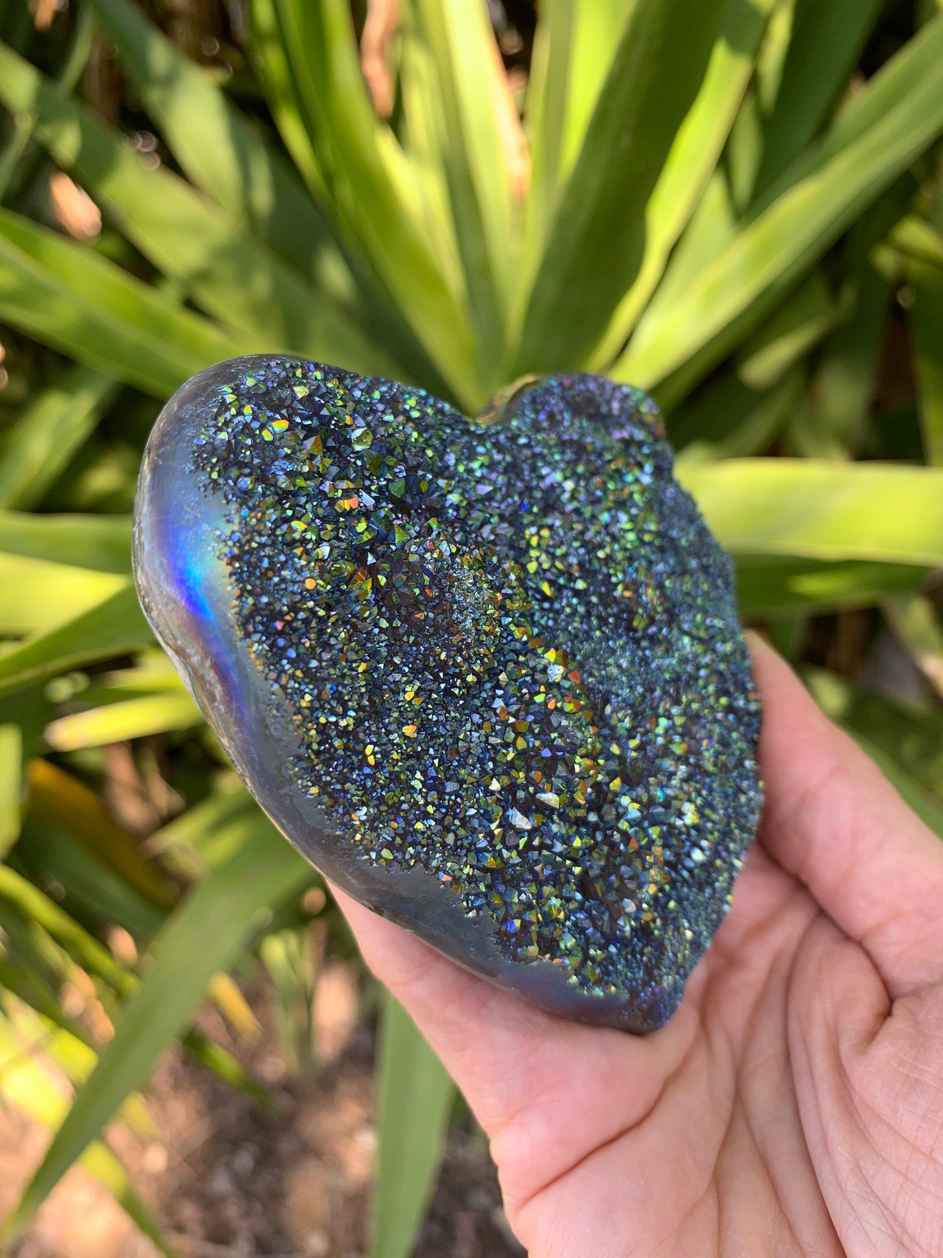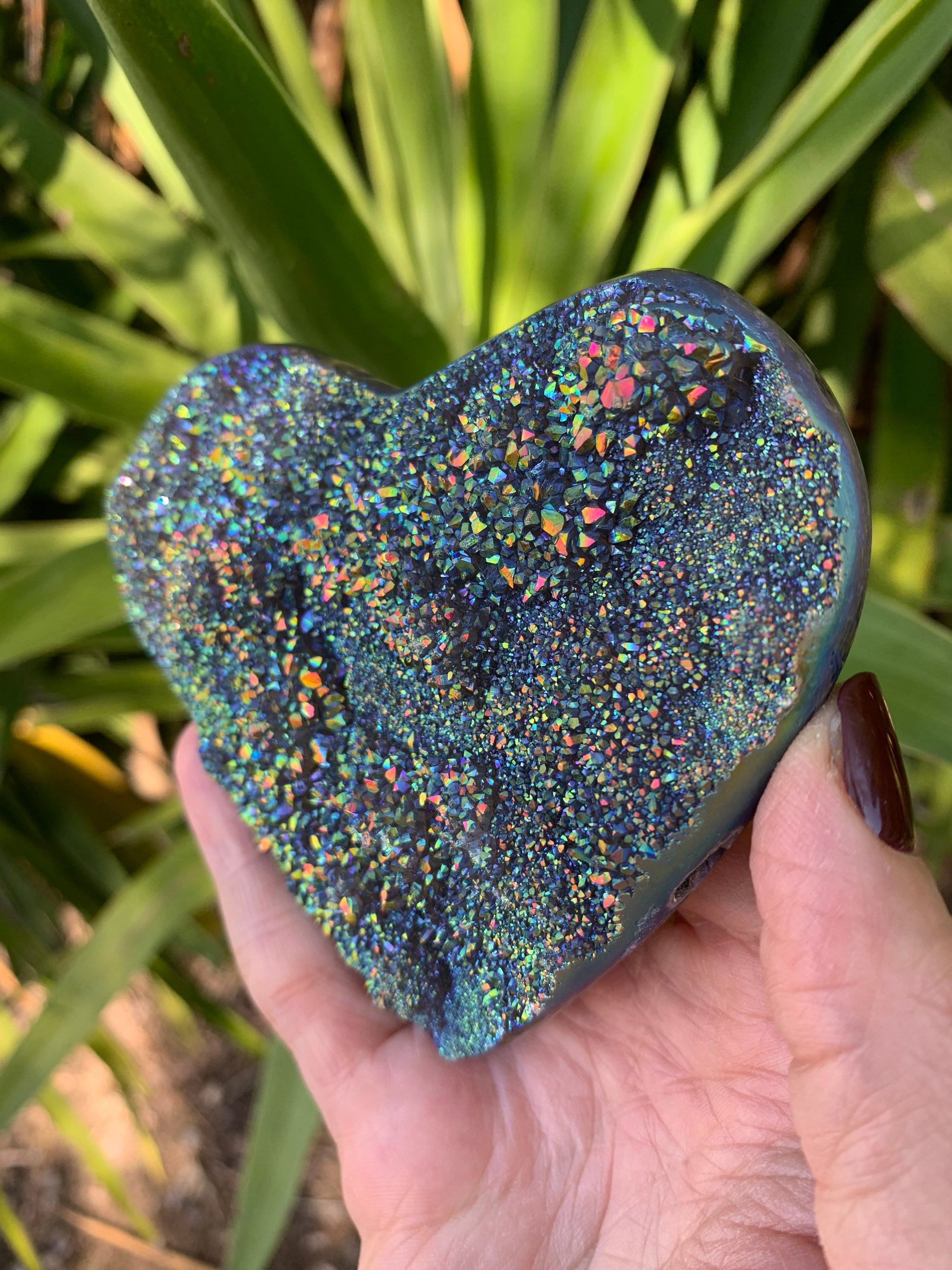 Surround yourself with white light, love, beauty and great energy with this extra special Titanium Aura coated Amethyst heart. This piece is a magical, metallic mix of rainbow colors in which the faceted crystal points shimmer and change color as they move and send light in different angles.