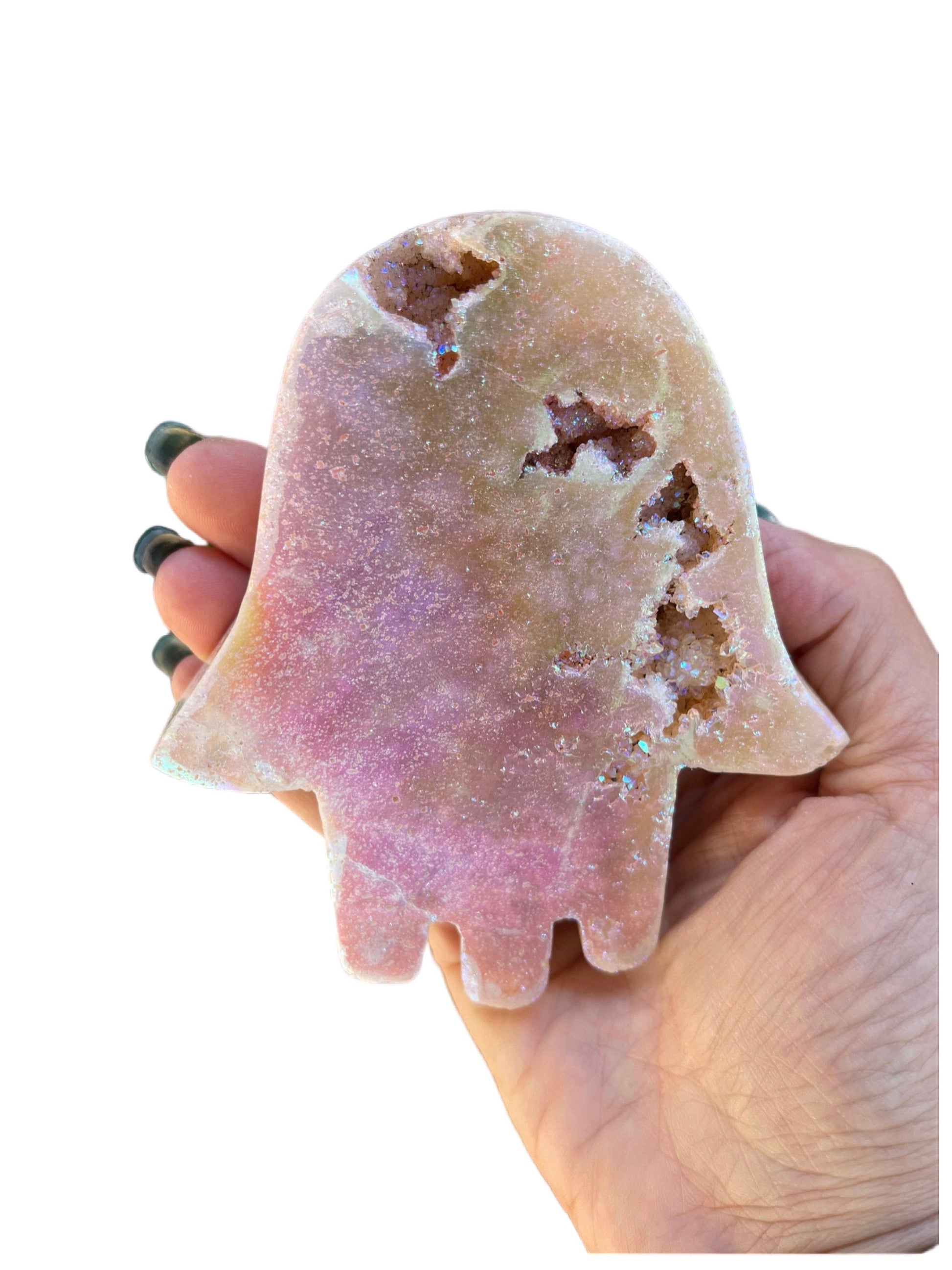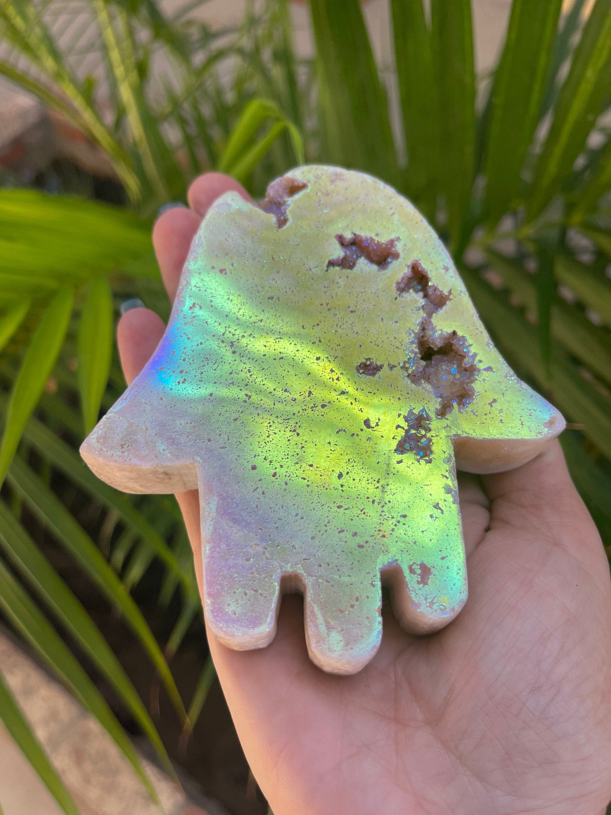 Surround yourself with white light, love, beauty and great energy with this Angel Aura Pink Amethyst Hamsa. This beauty has nice pockets of druzy sparkle & beautiful shimmering colors. It’s hard to capture its full beauty in photos.