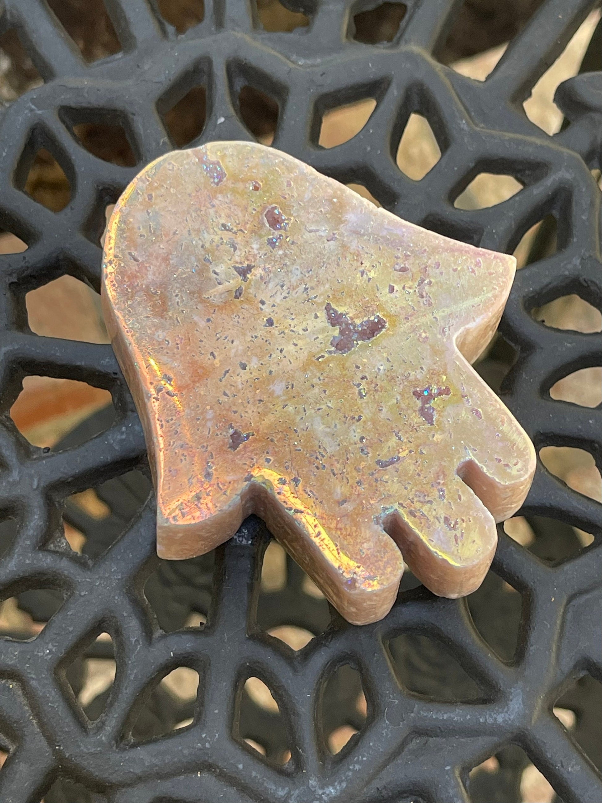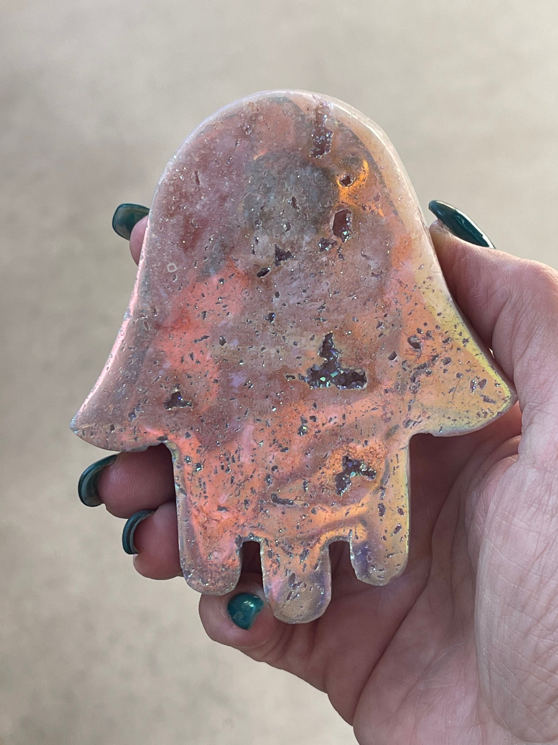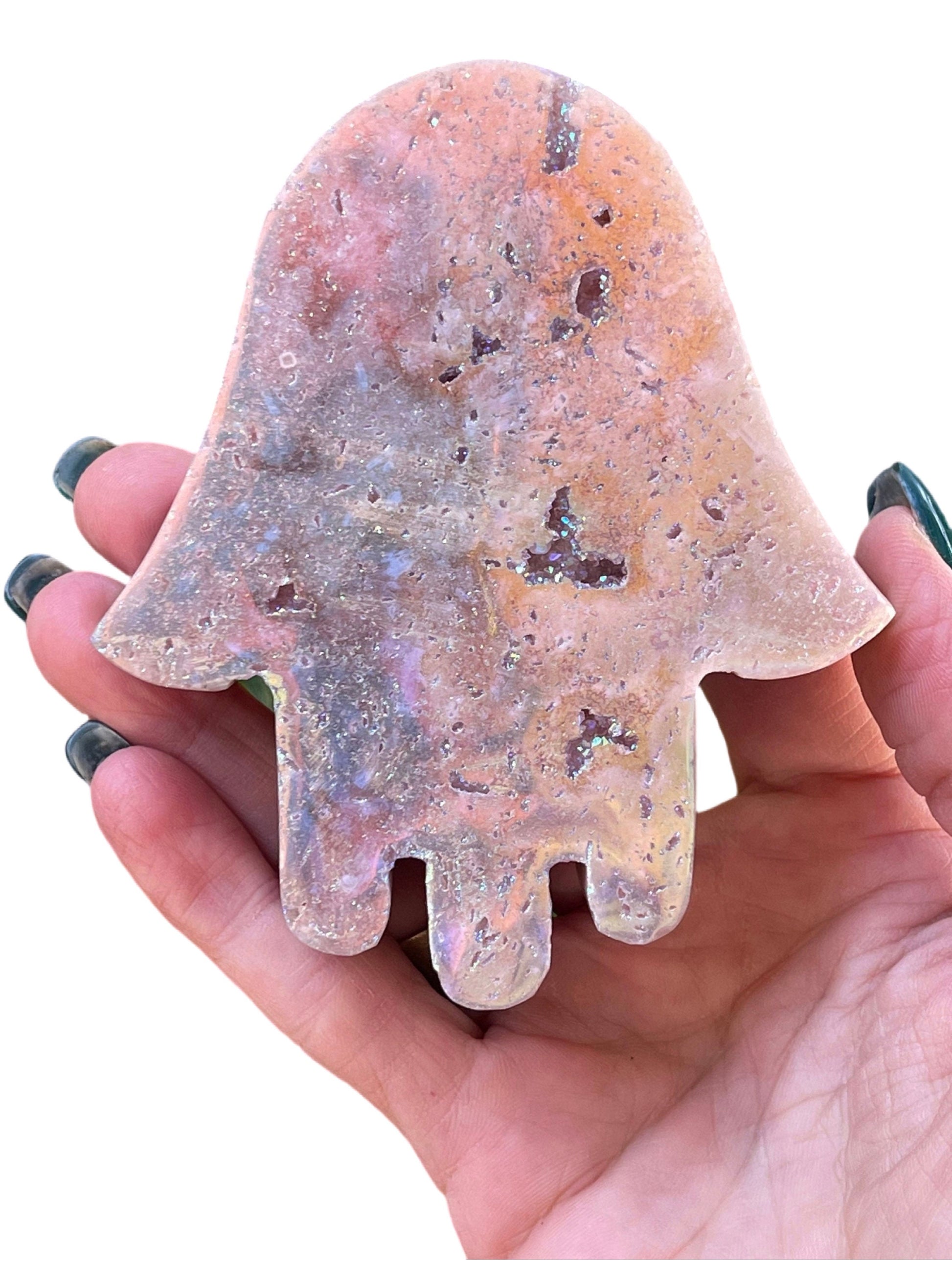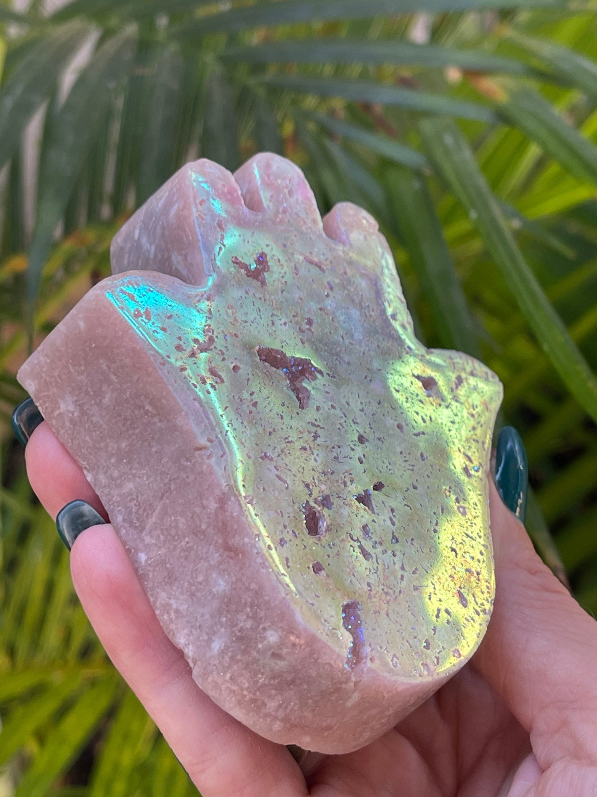 Surround yourself with white light, love, beauty and great energy with this Angel Aura Pink Amethyst Hamsa. This beauty has nice pockets of druzy sparkle & beautiful shimmering colors. It’s hard to capture its full beauty in photos.
