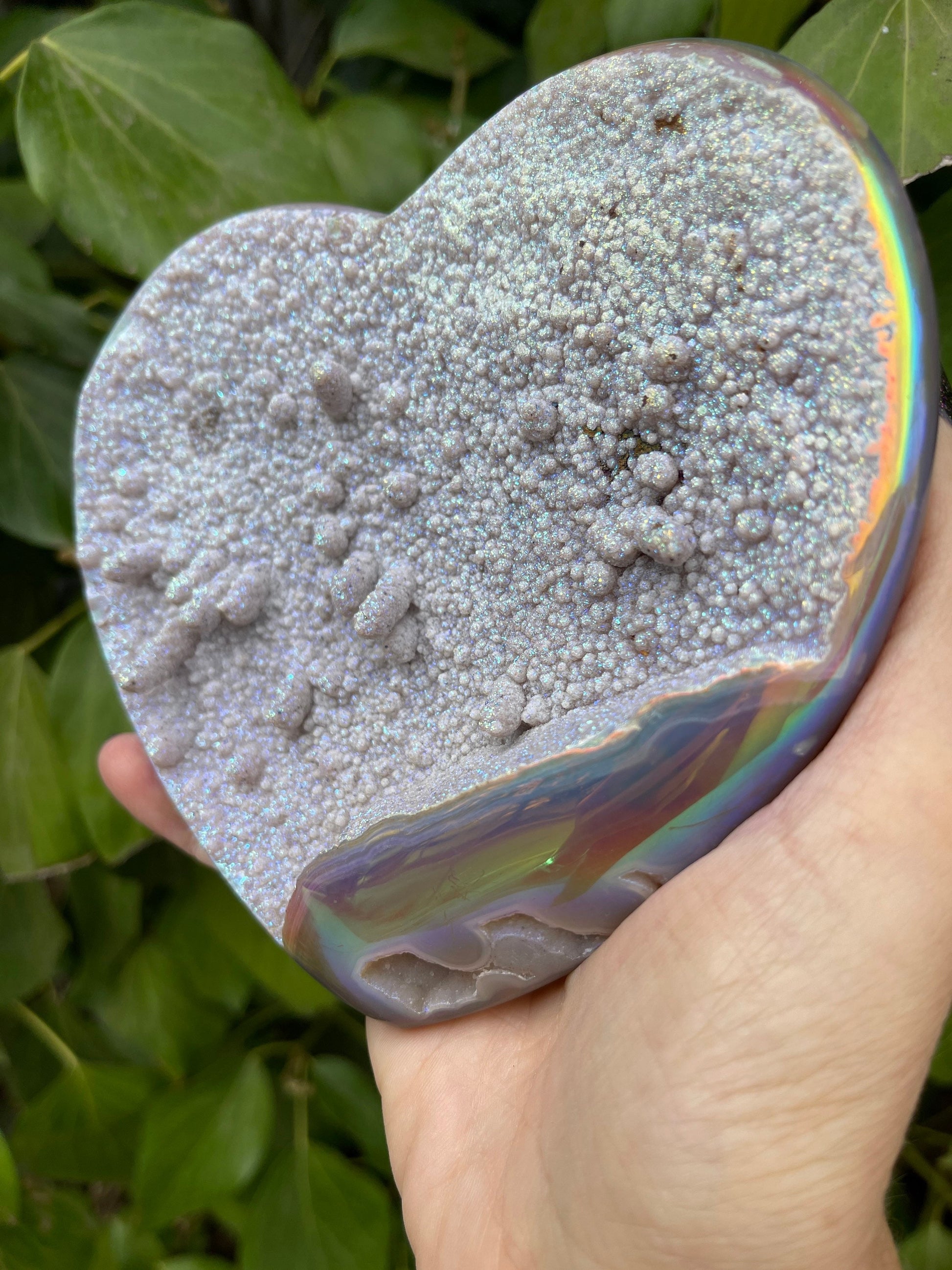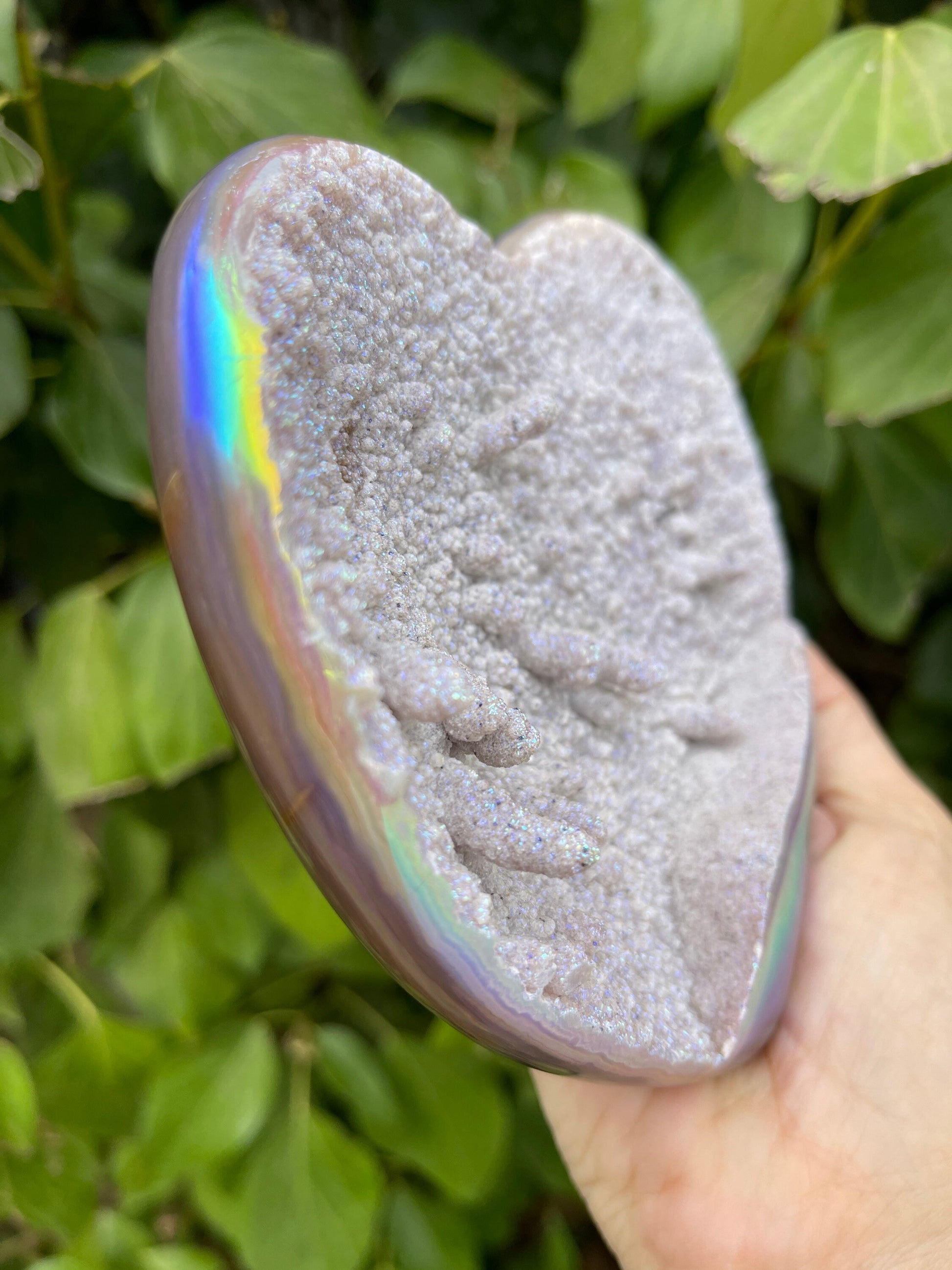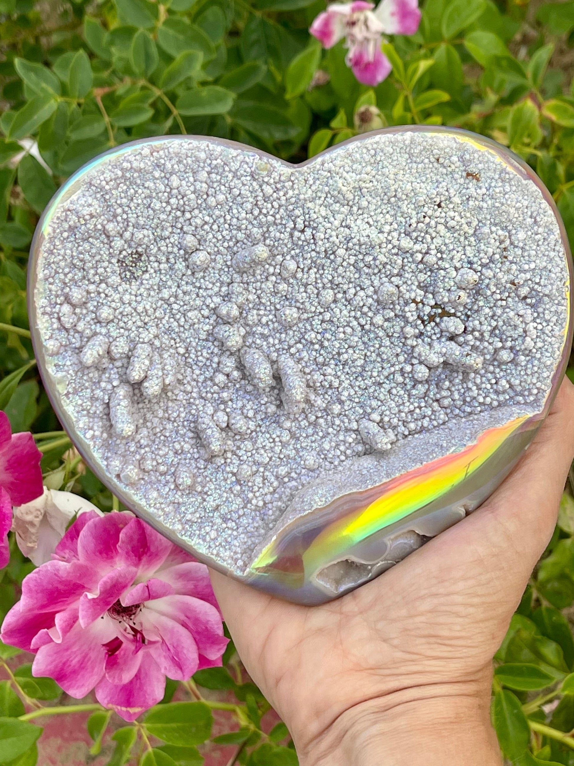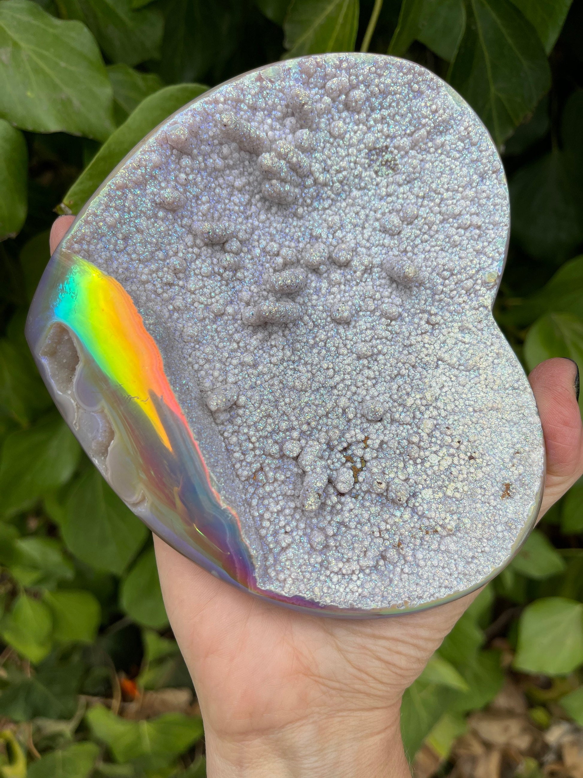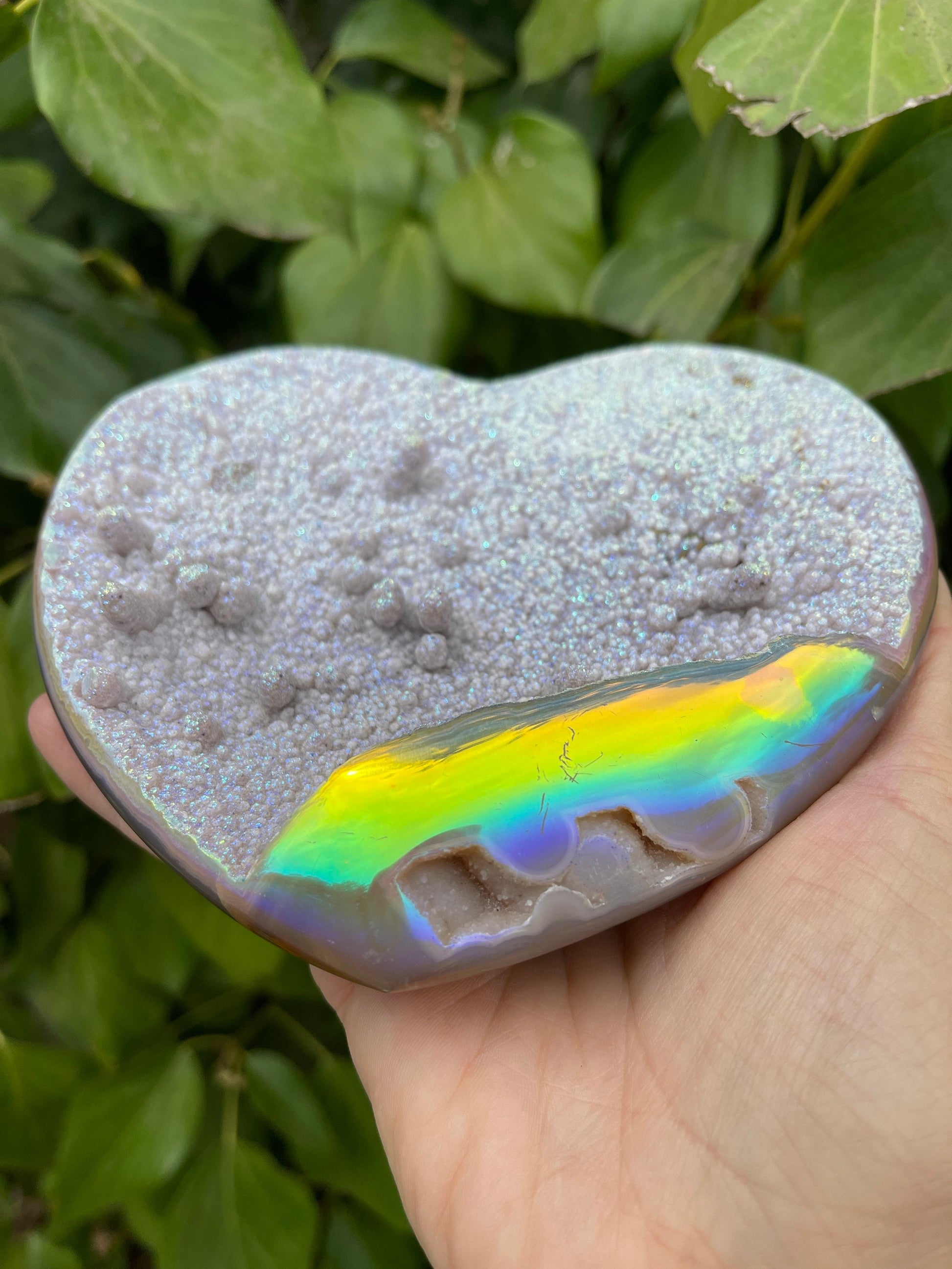 Surround yourself with white light, love & great energy with this gorgeous Aura coated, druzyAgate heart. Beautiful microfine druzy sparkles amidst a perfect rainbow polished edge. The back is polished. This piece will bring balance, beauty and great energy to any space.