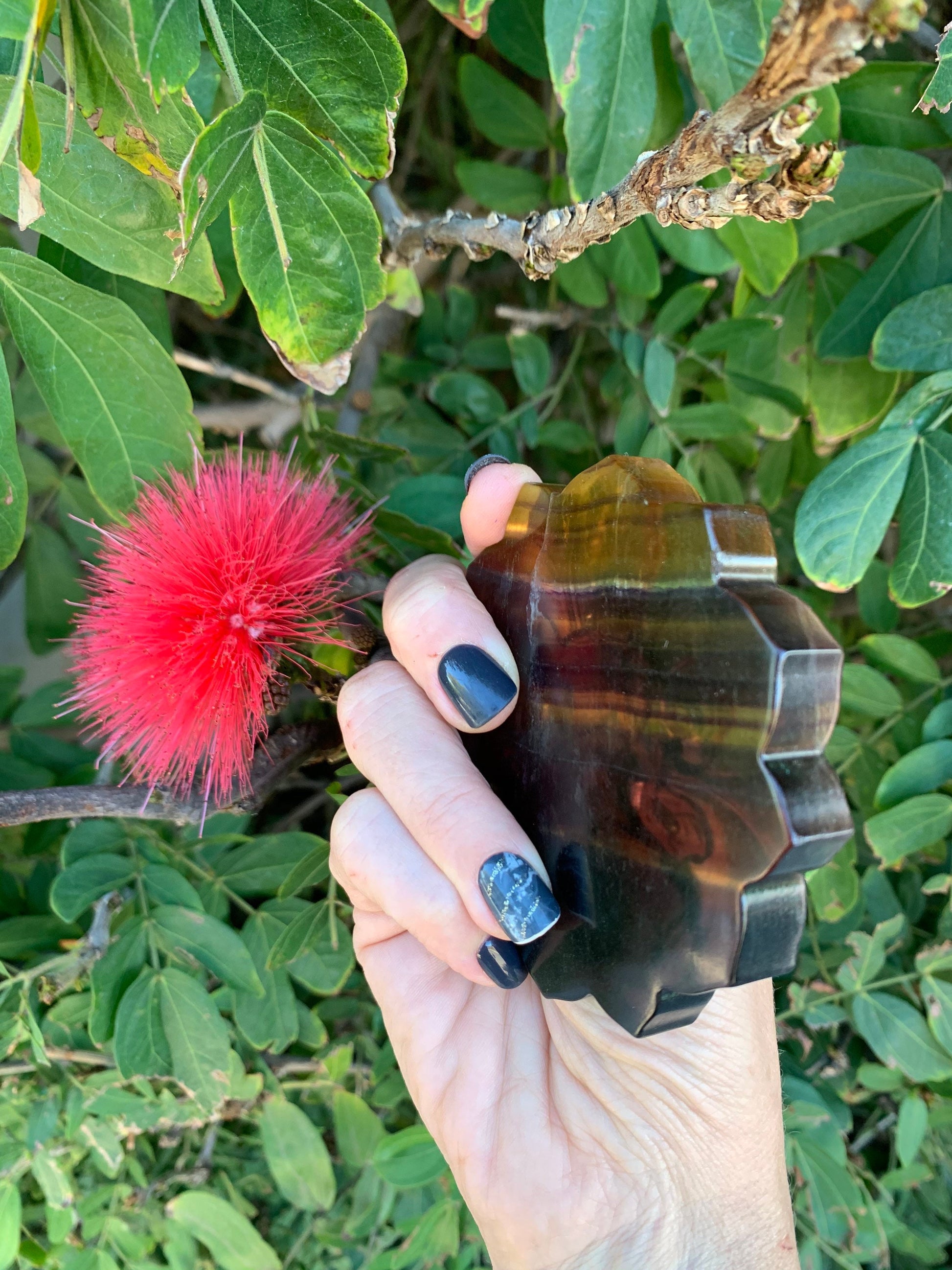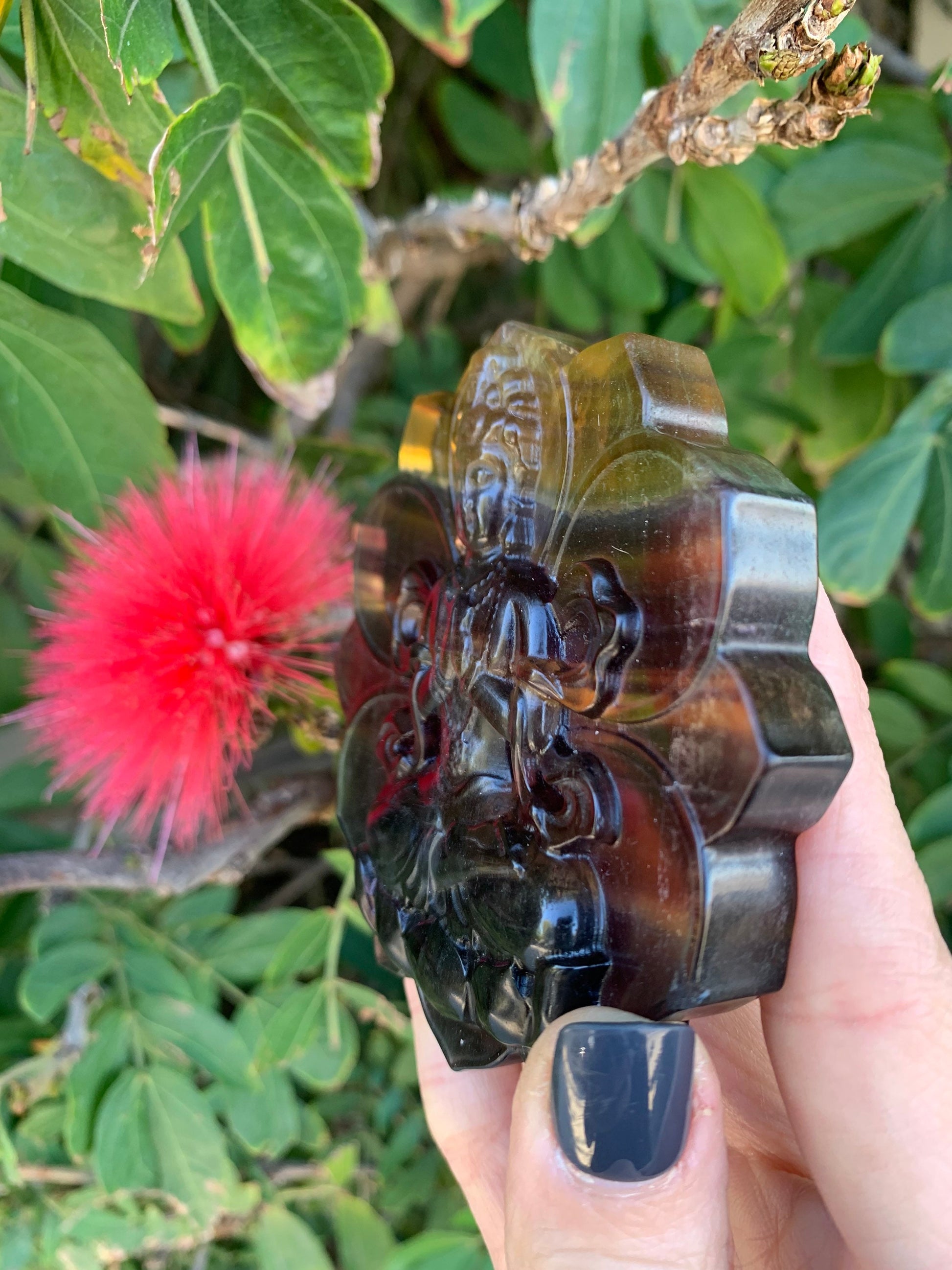 Elevate your sacred space with this beautiful, rainbow Fluorite Buddha carving. The colors are gorgeous and it has beautiful detail.