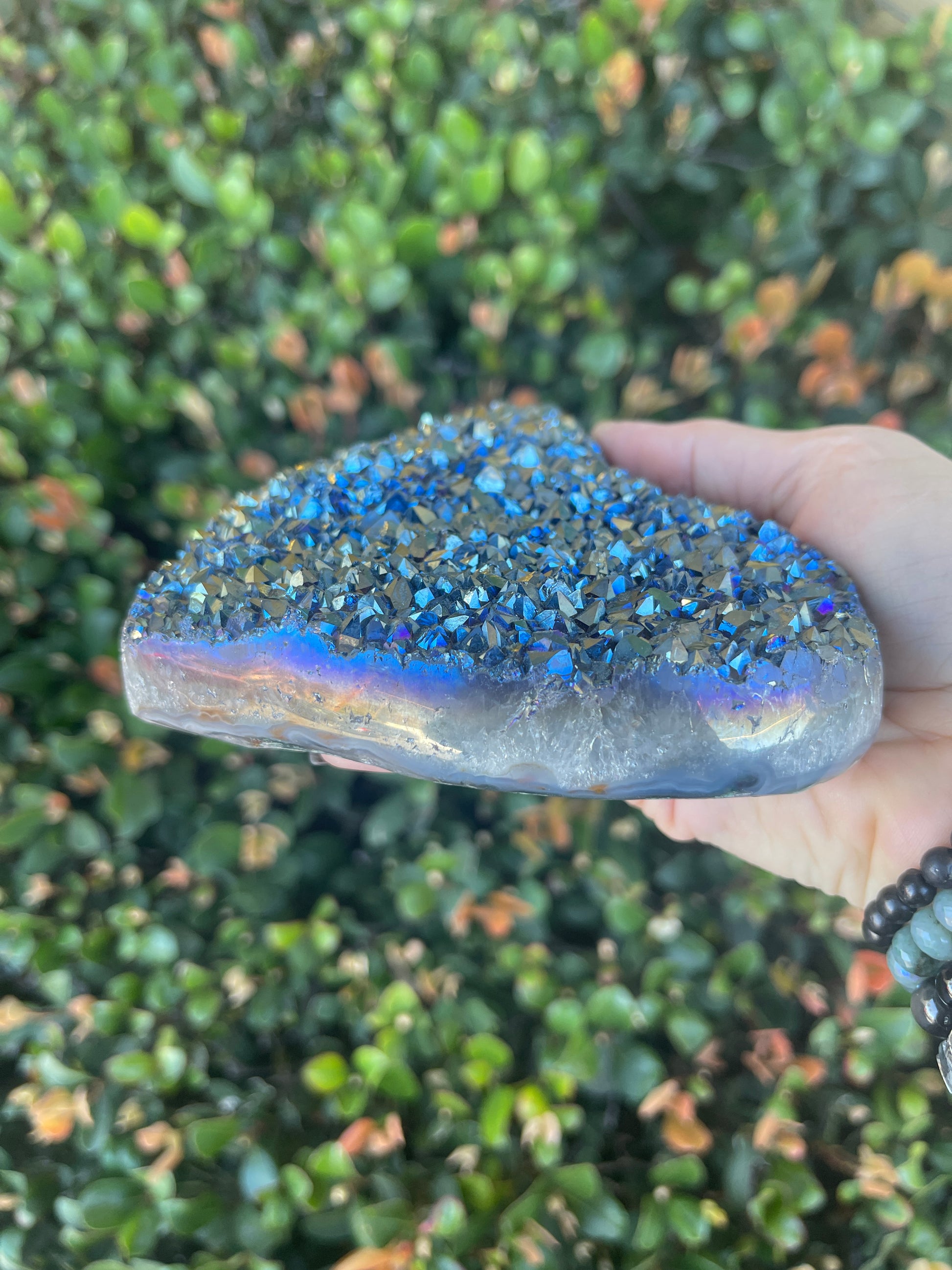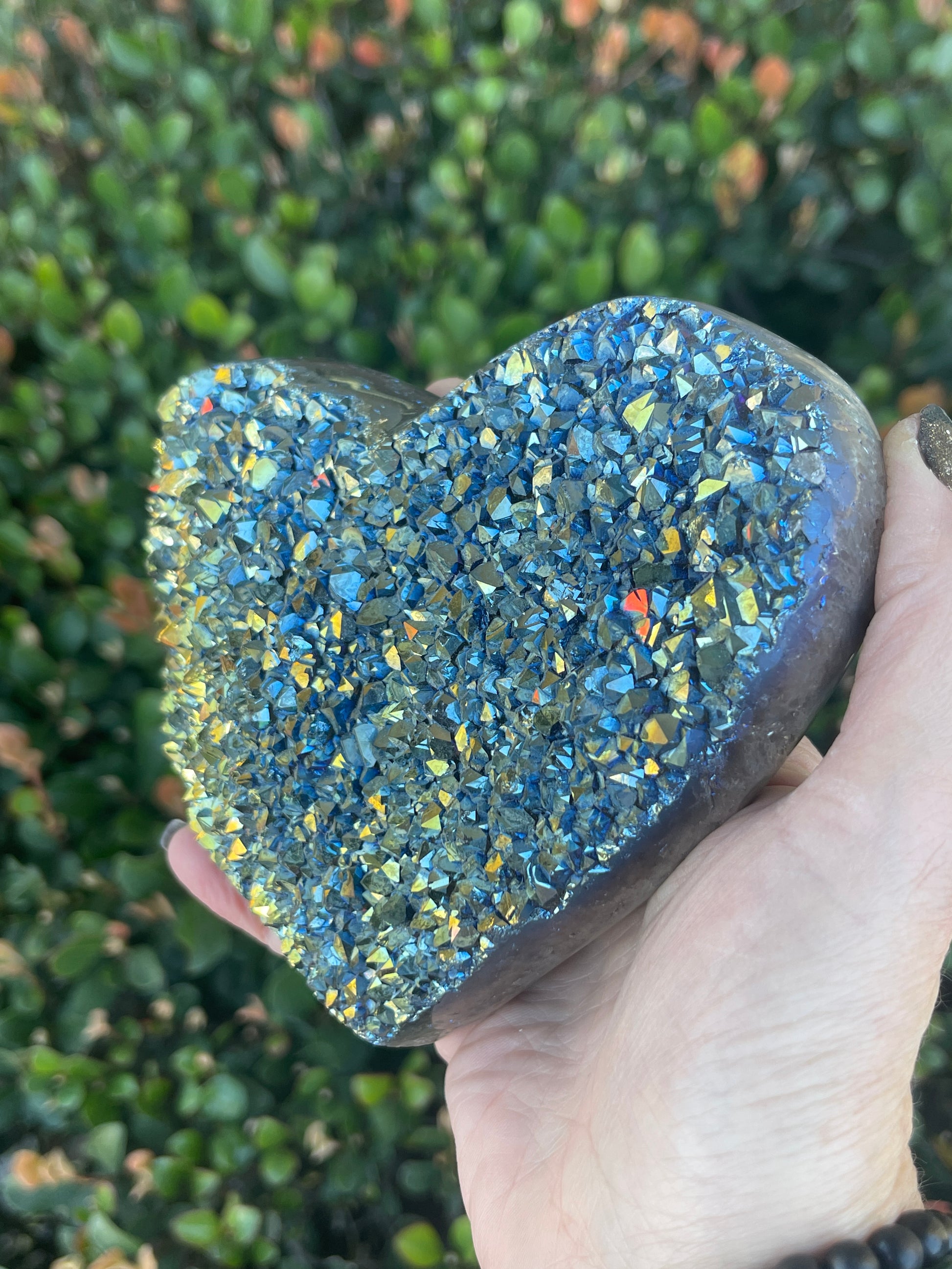 Adorn your space with love, light and great energy with this beautiful titanium aura Amethyst heart. This heart is a magical, metallic mix of rainbow colors in which the faceted crystal points shimmer and change color as they move and send light in different angles. This beauty is a gorgeous mix of blue, gold, green & silver tones. It even has some lovely crystal formations on the back side.