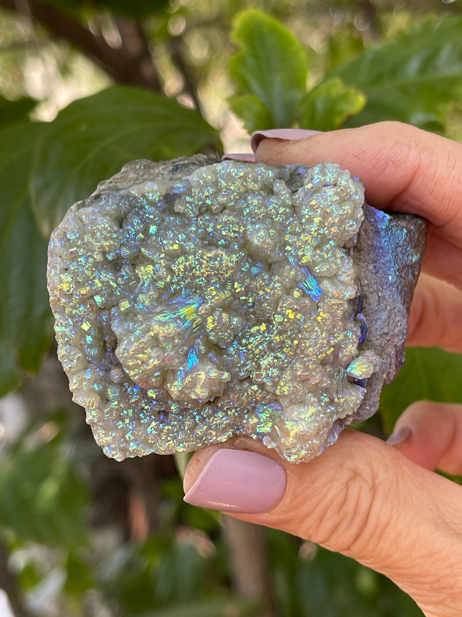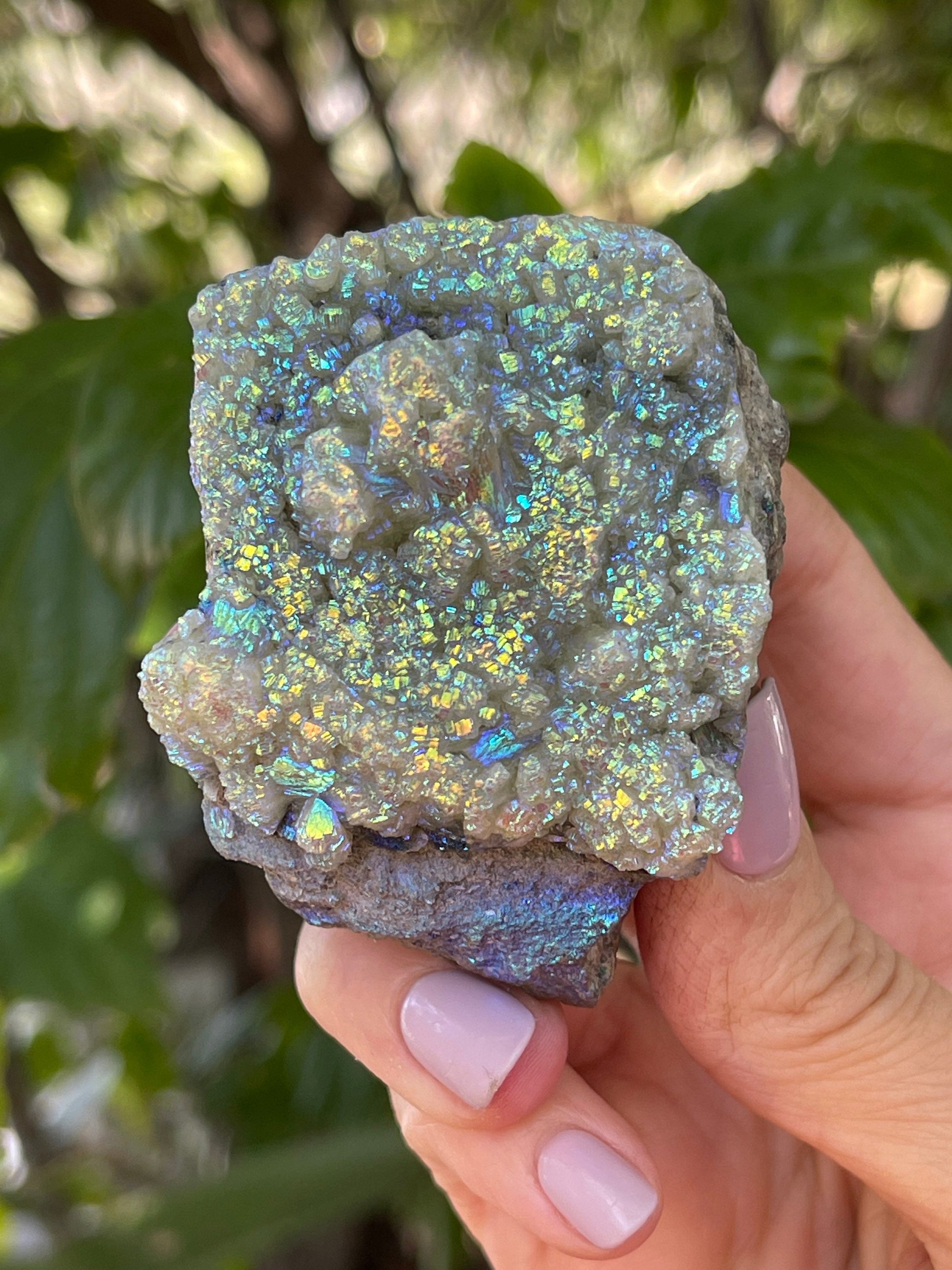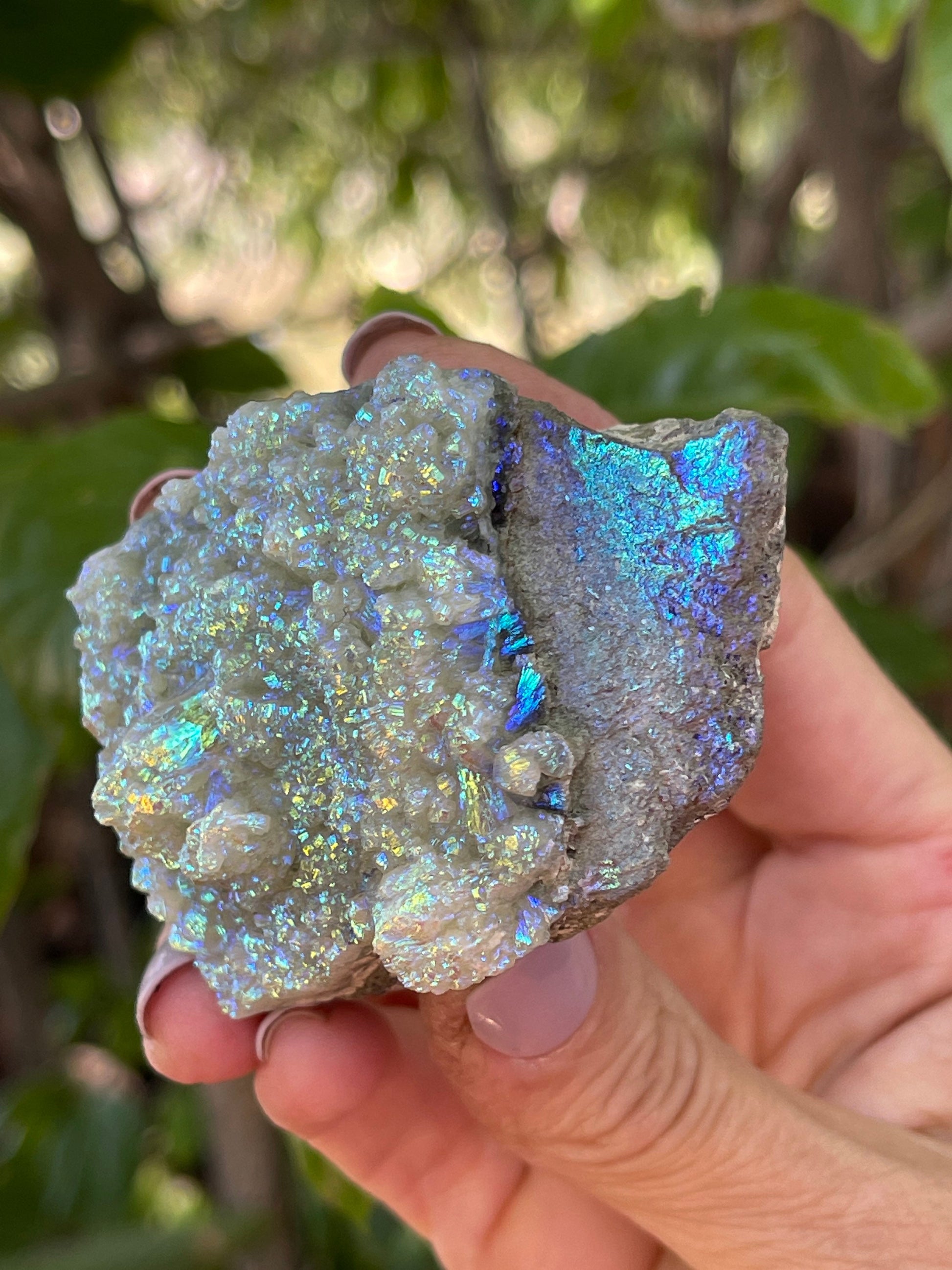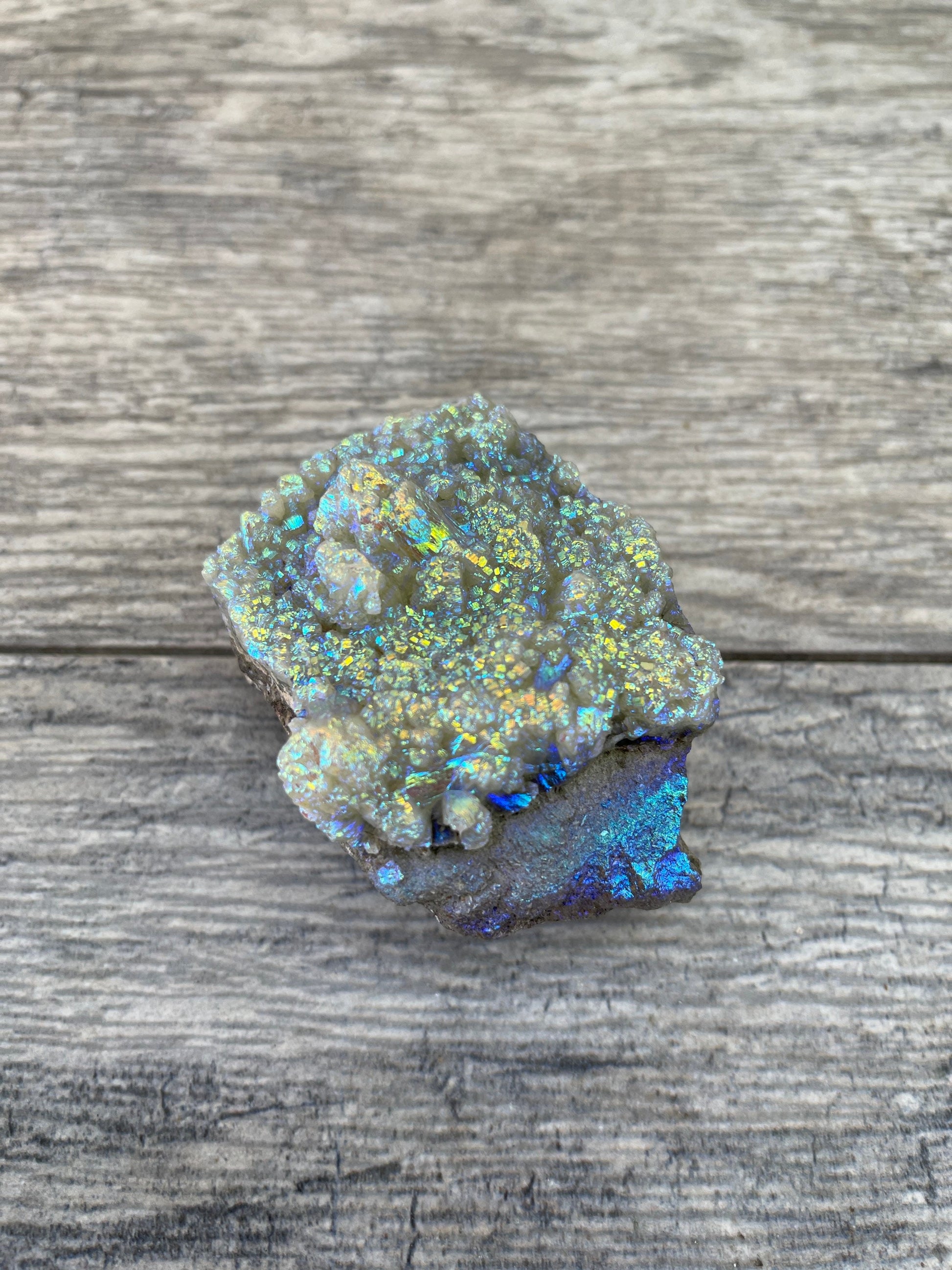 These beauties are a magical, ethereal mix of colors in which the crystal formation shimmers and changes color as it moves and sends light in different angles.