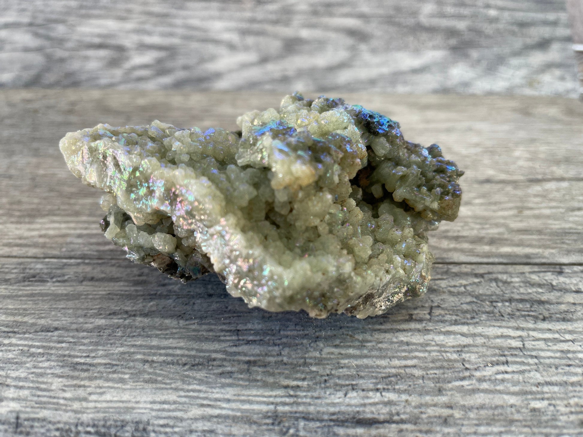 Surround yourself with white light and love with this beautiful, extra special Angel Aura coated Prehnite cluster.