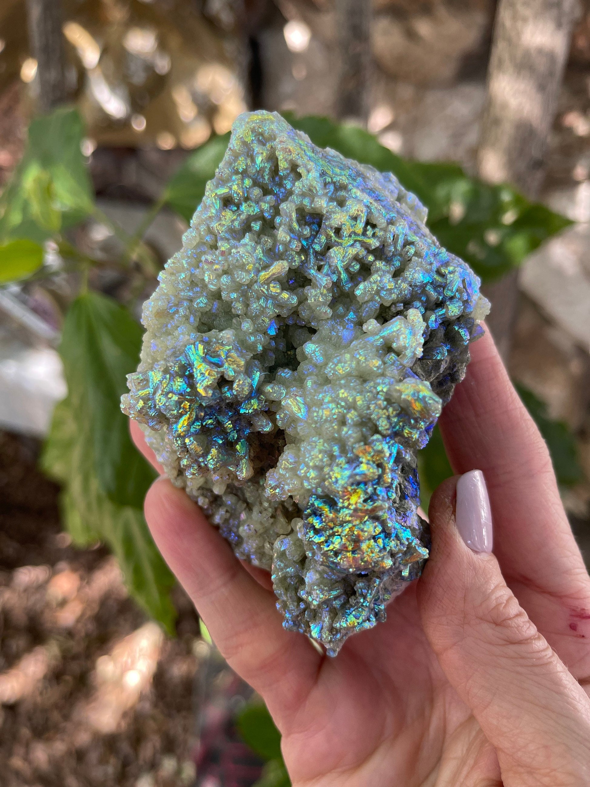 These beauties are a magical, ethereal mix of colors in which the crystal formation shimmers and changes color as it moves and sends light in different angles.