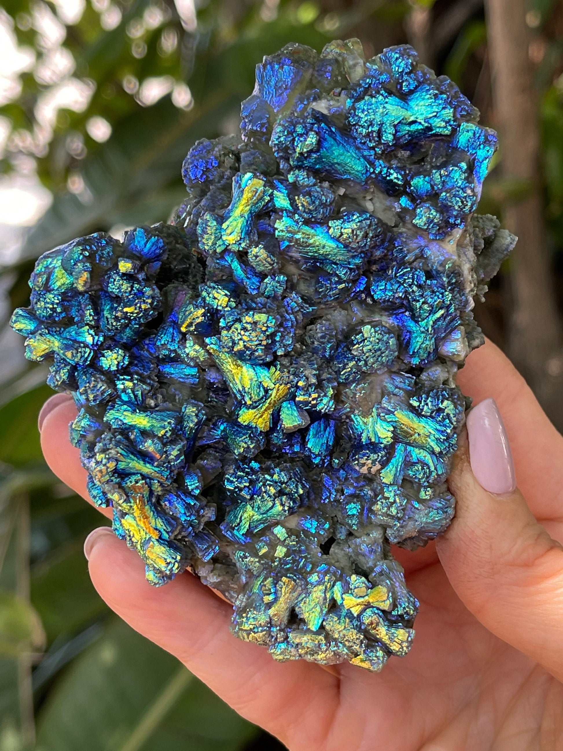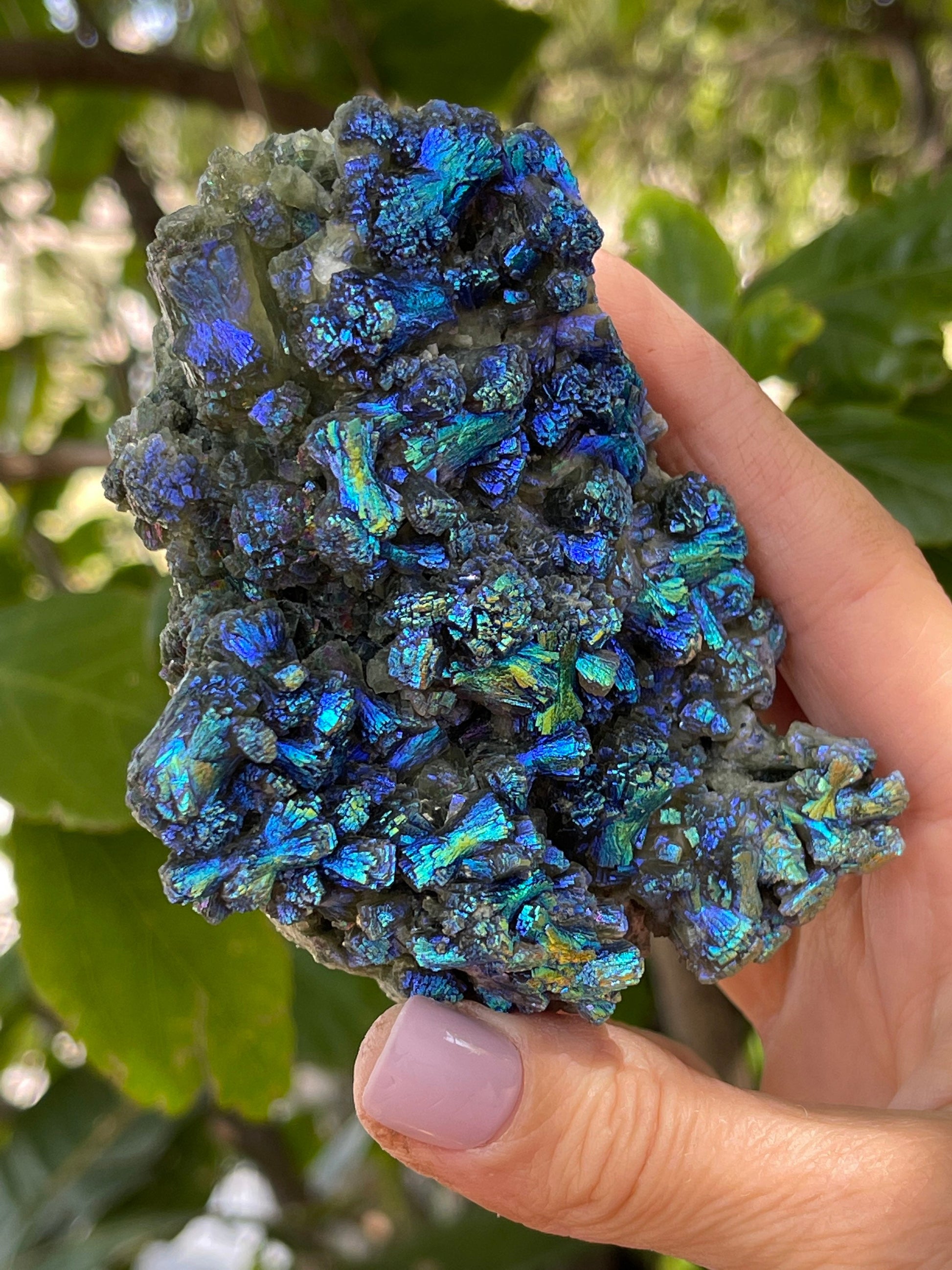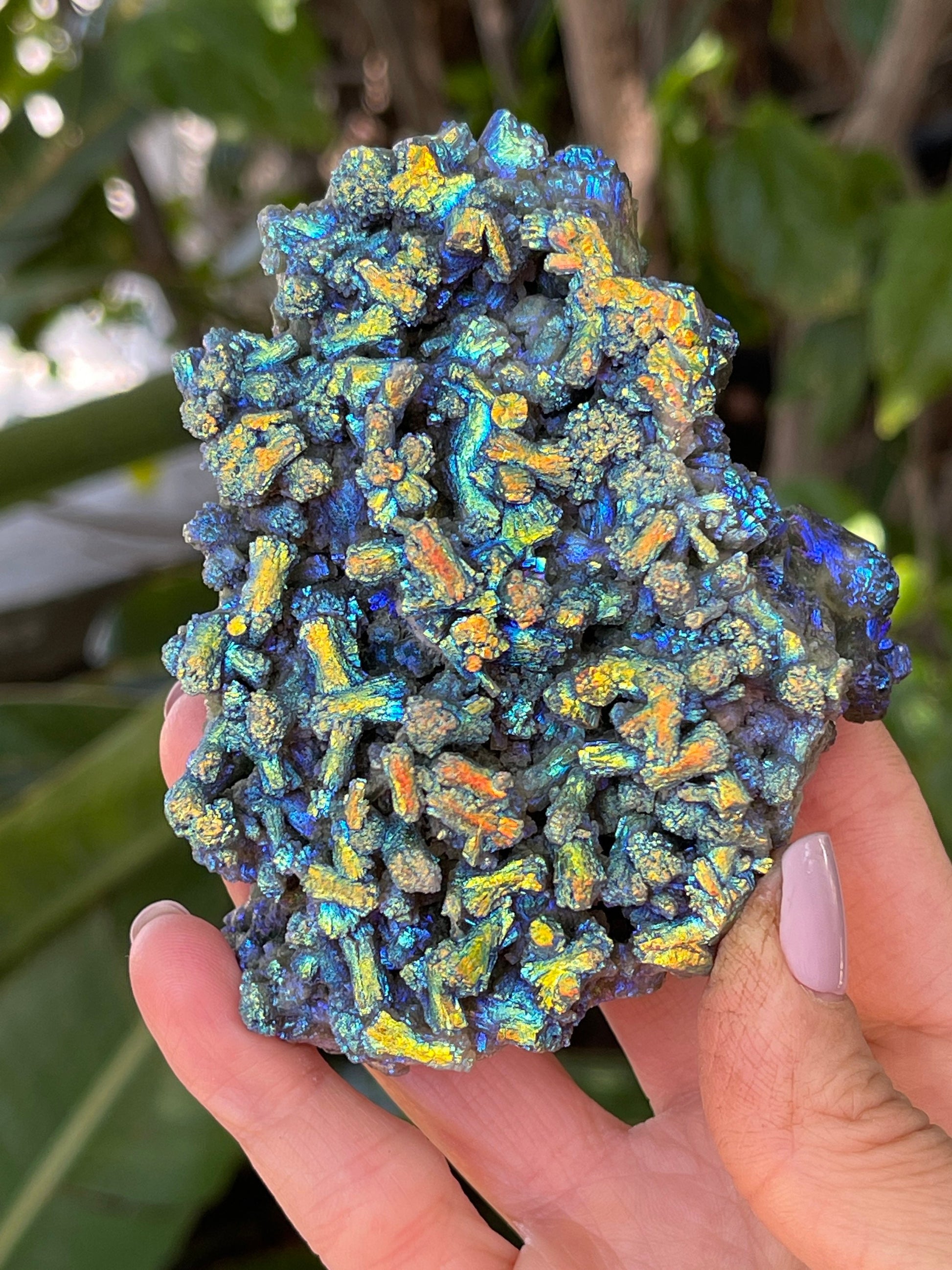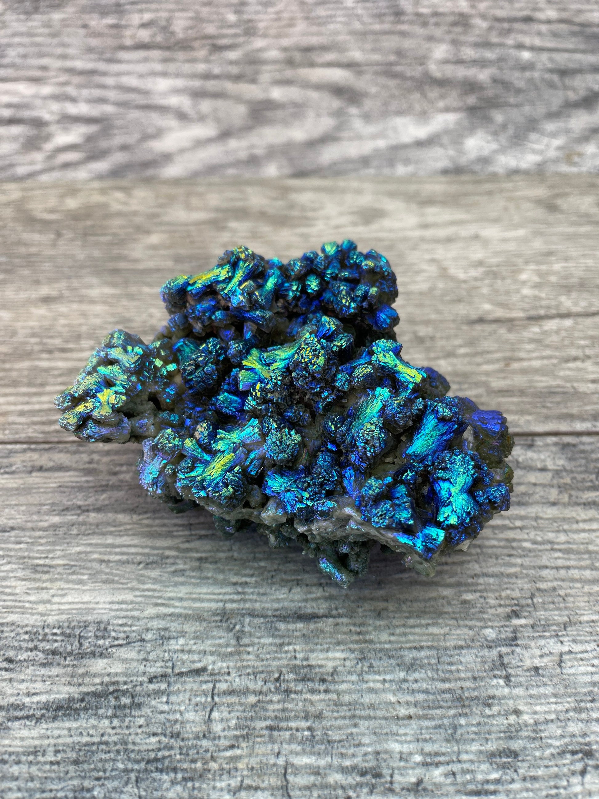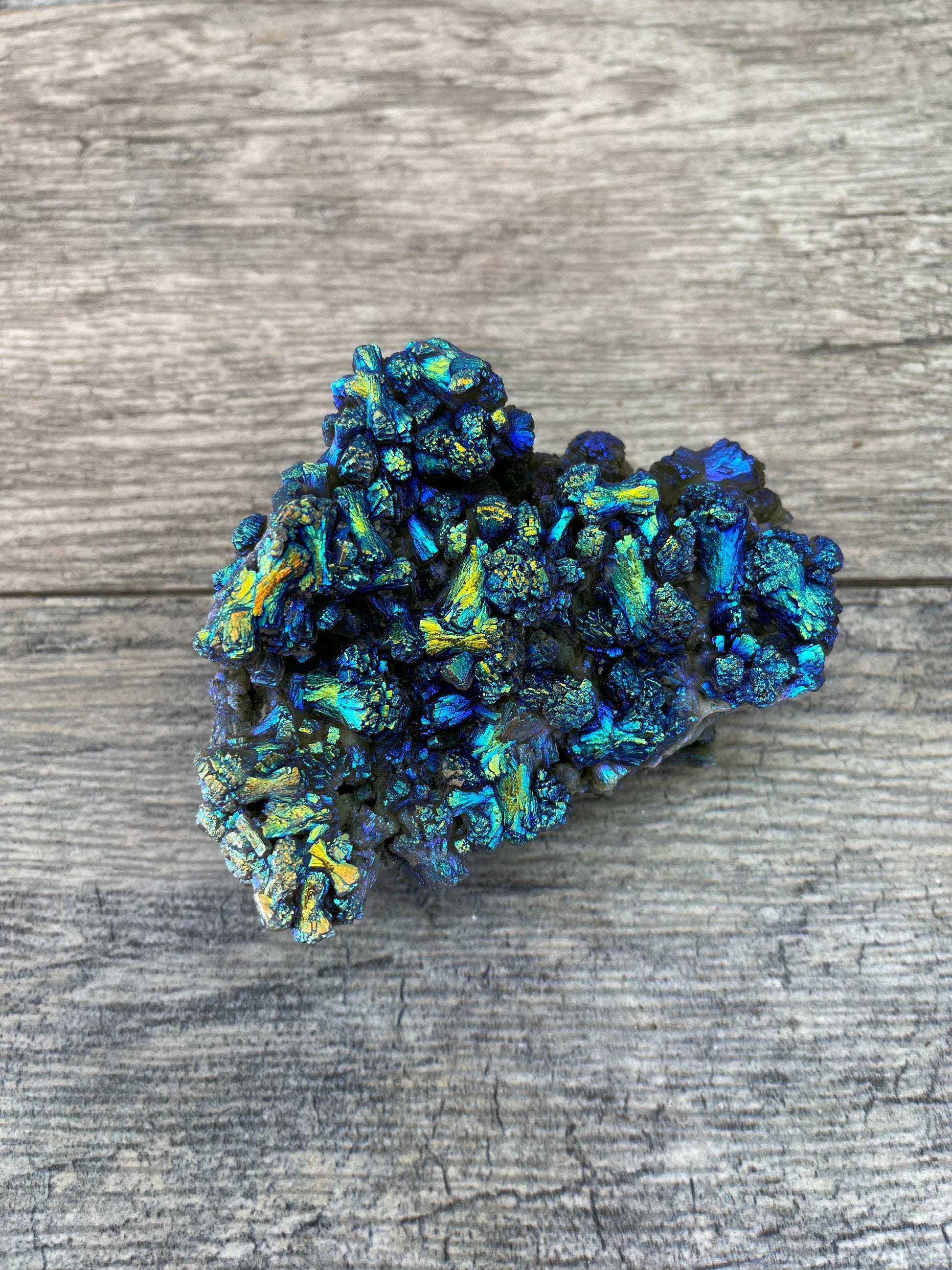 These beauties are a magical, ethereal mix of colors in which the crystal formation shimmers and changes color as it moves and sends light in different angles.
