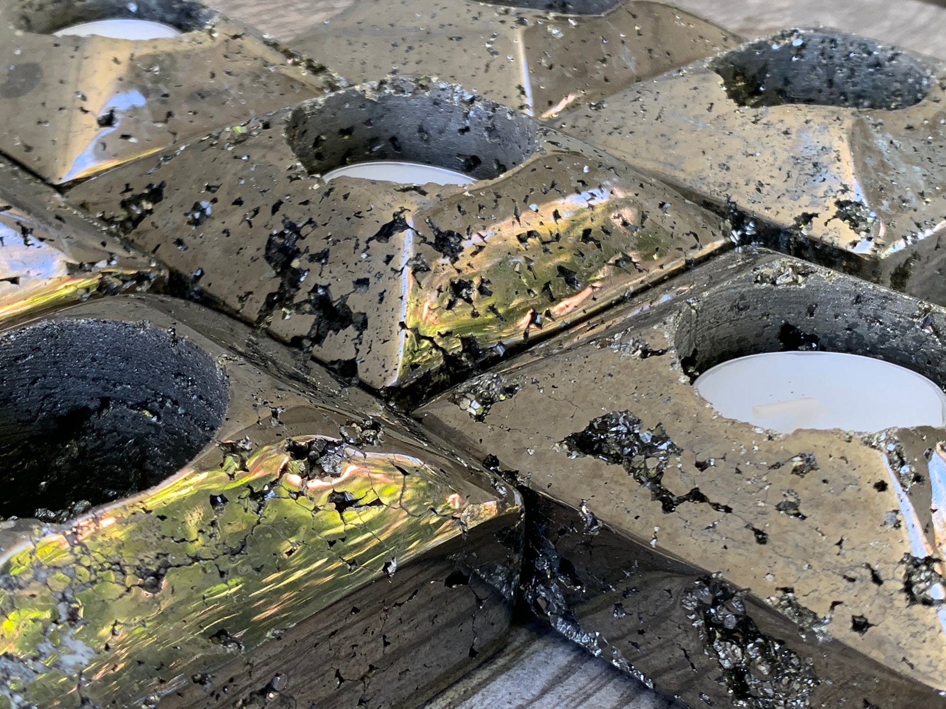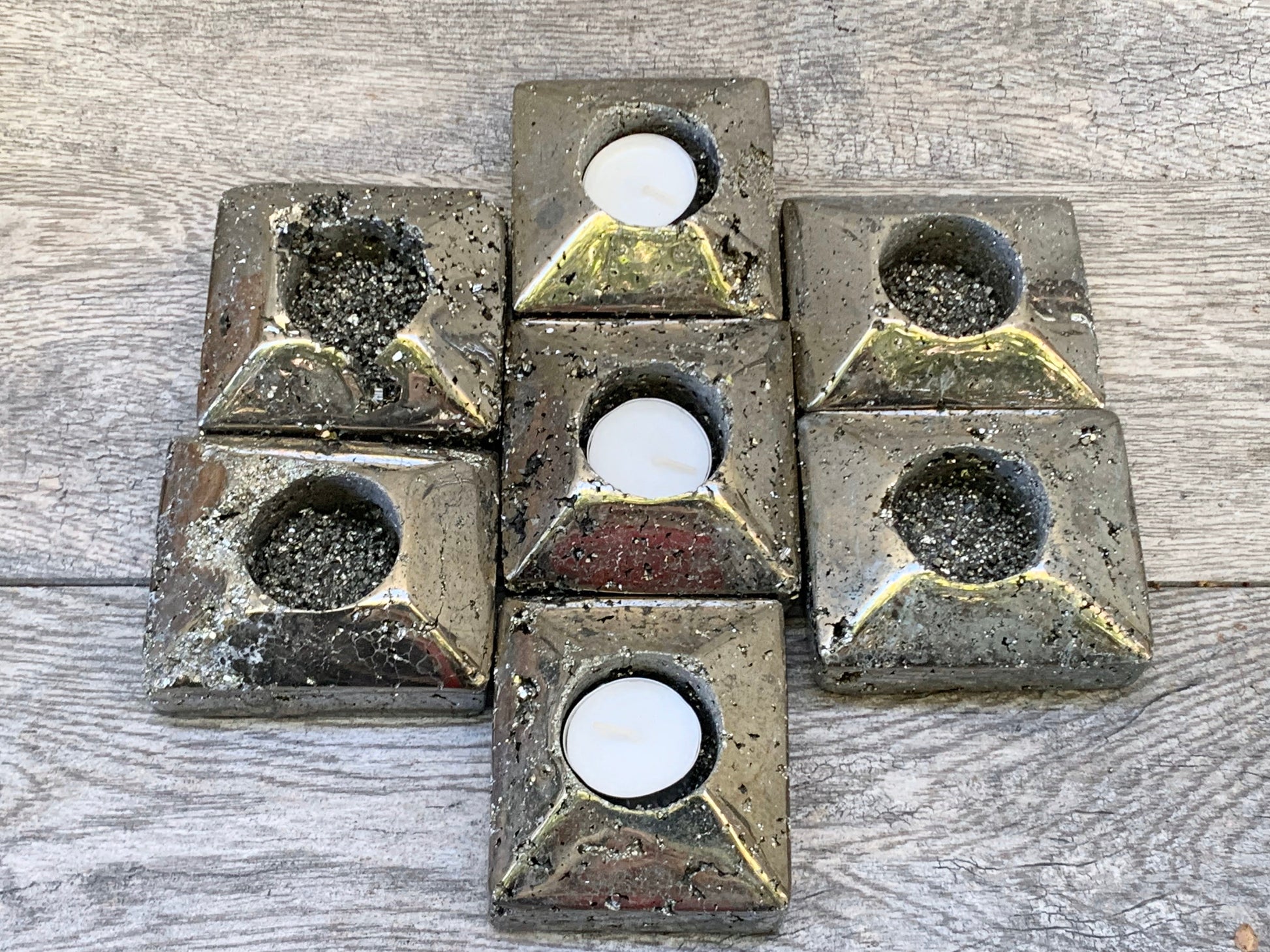 Surround yourself with white light, love, beauty and great energy with these raw Pyrite square shape candleholders.