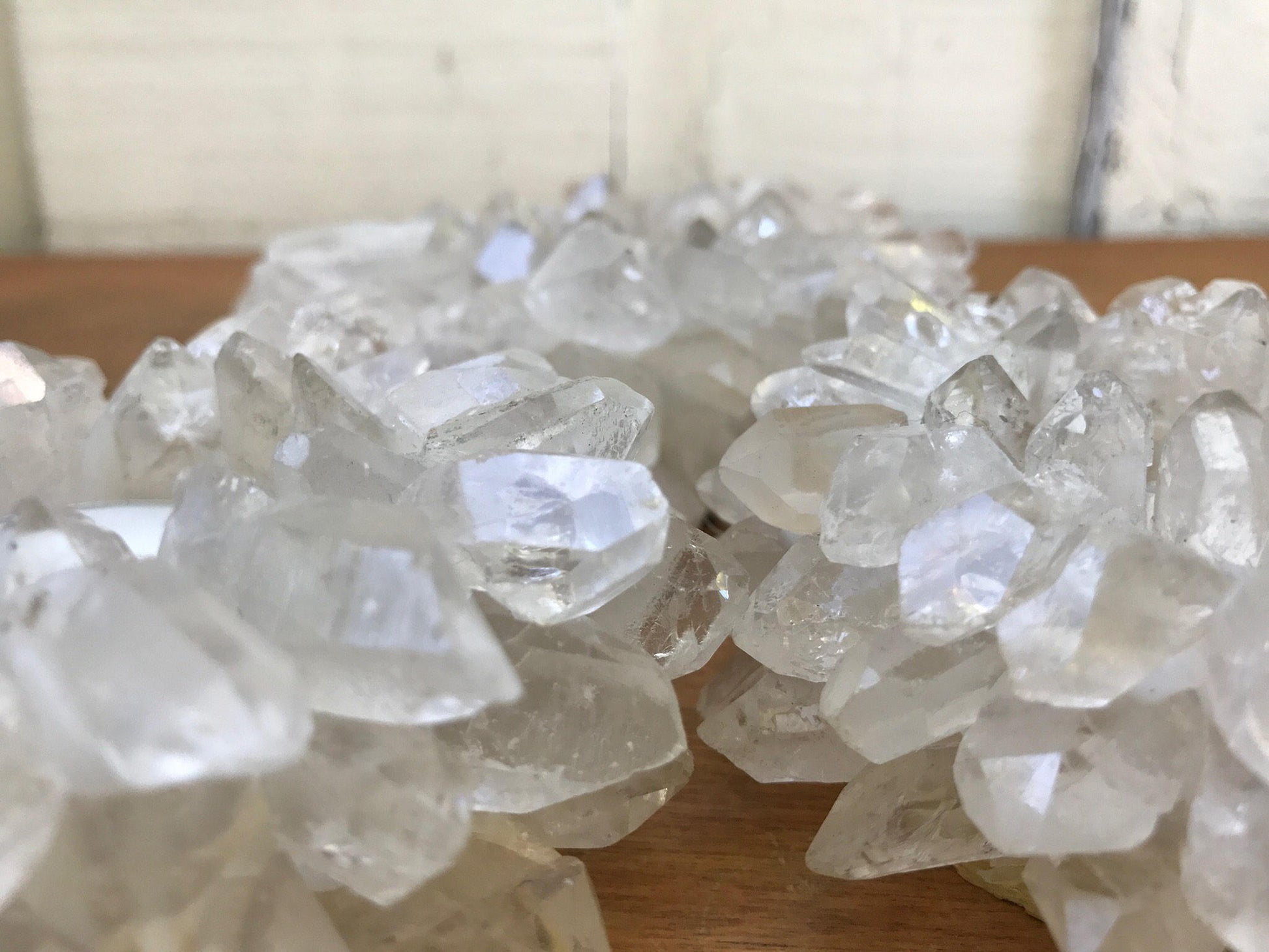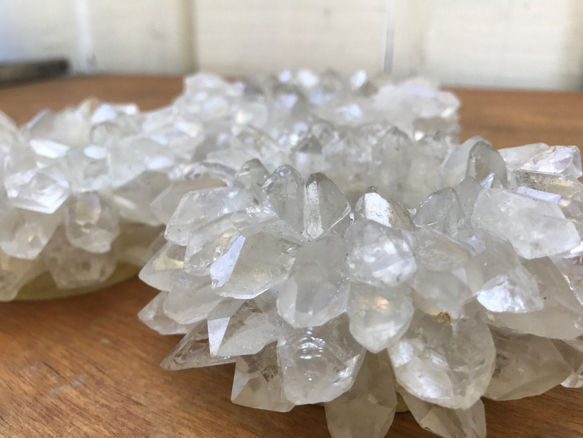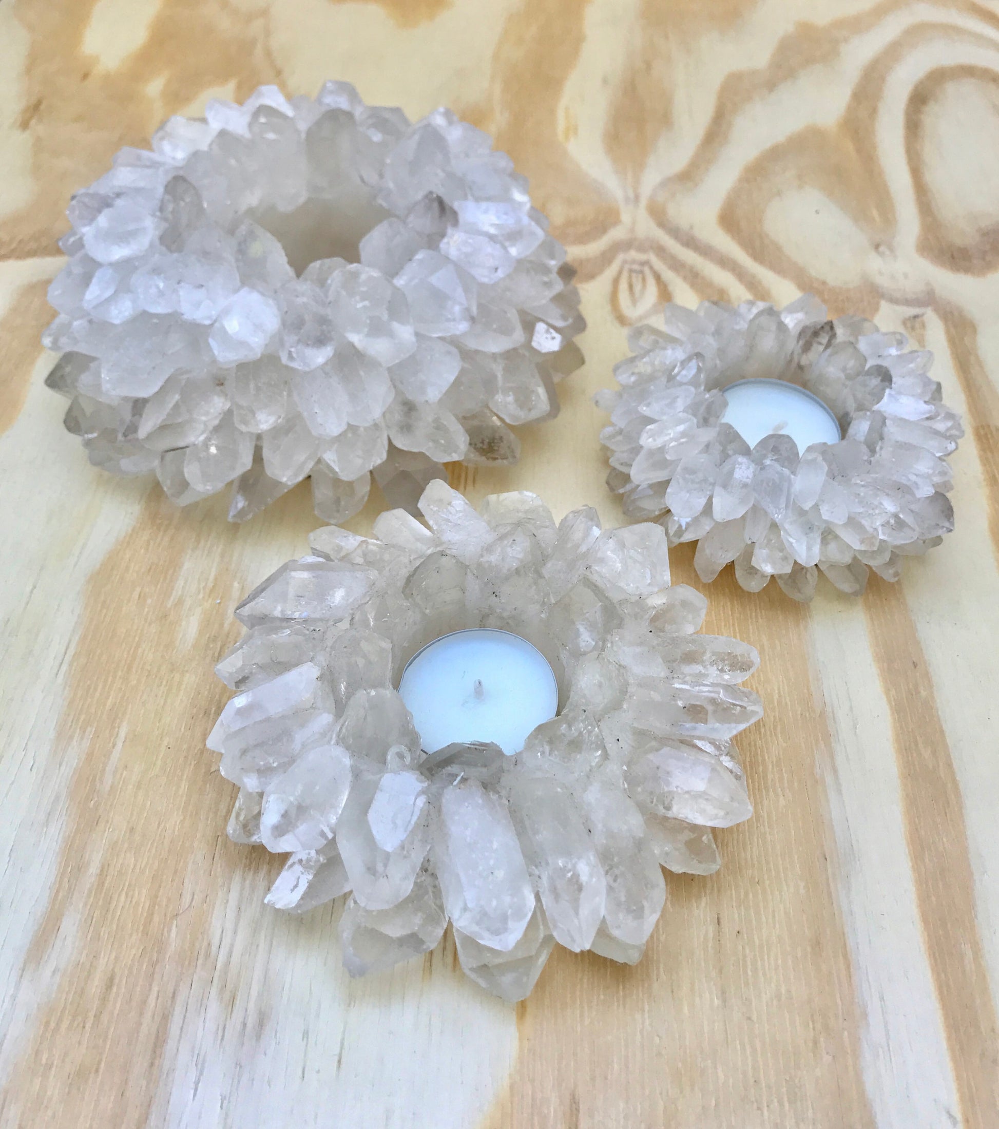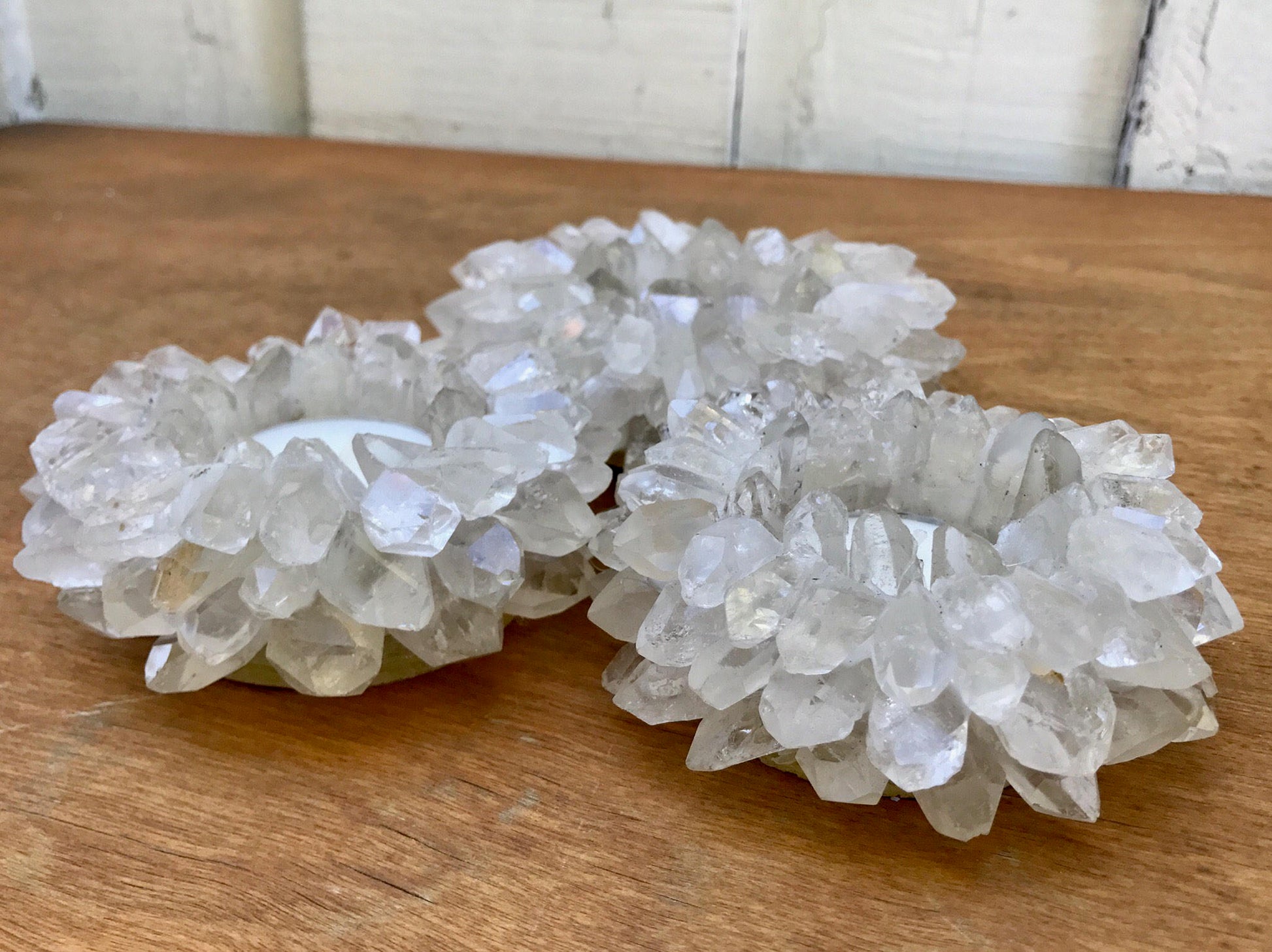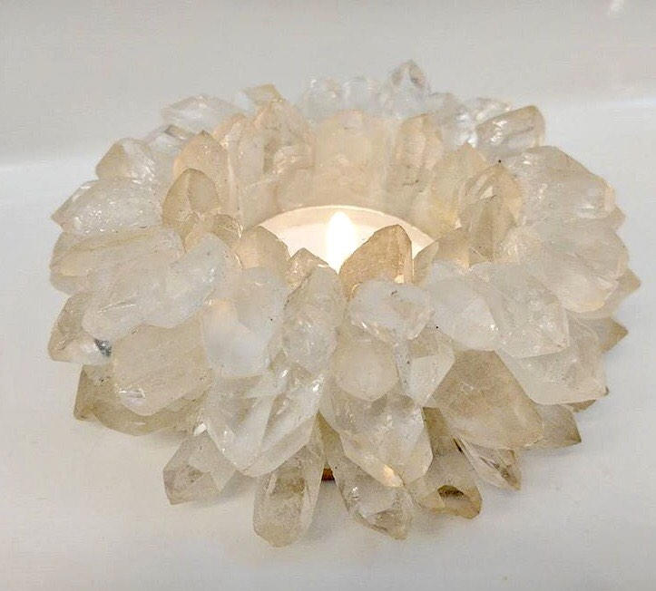 Surround yourself with white light and love with a beautiful, raw Quartz multi point tea light candle holder. These are so beautiful. They are made up of many quartz points and radiate beautiful energy in many directions.