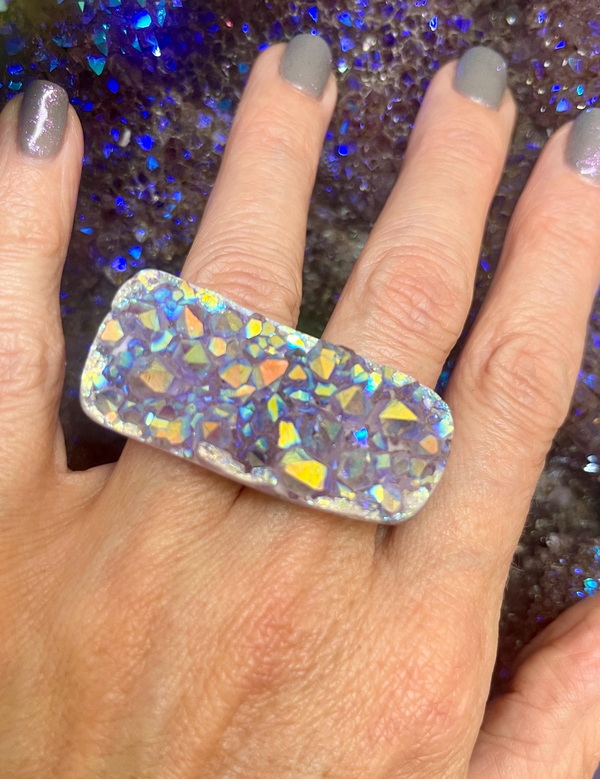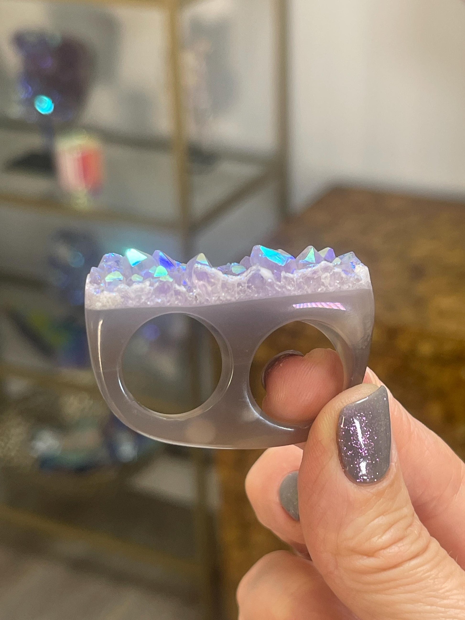 You will start conversations with this edgy Angel Aura coated Amethyst statement ring!