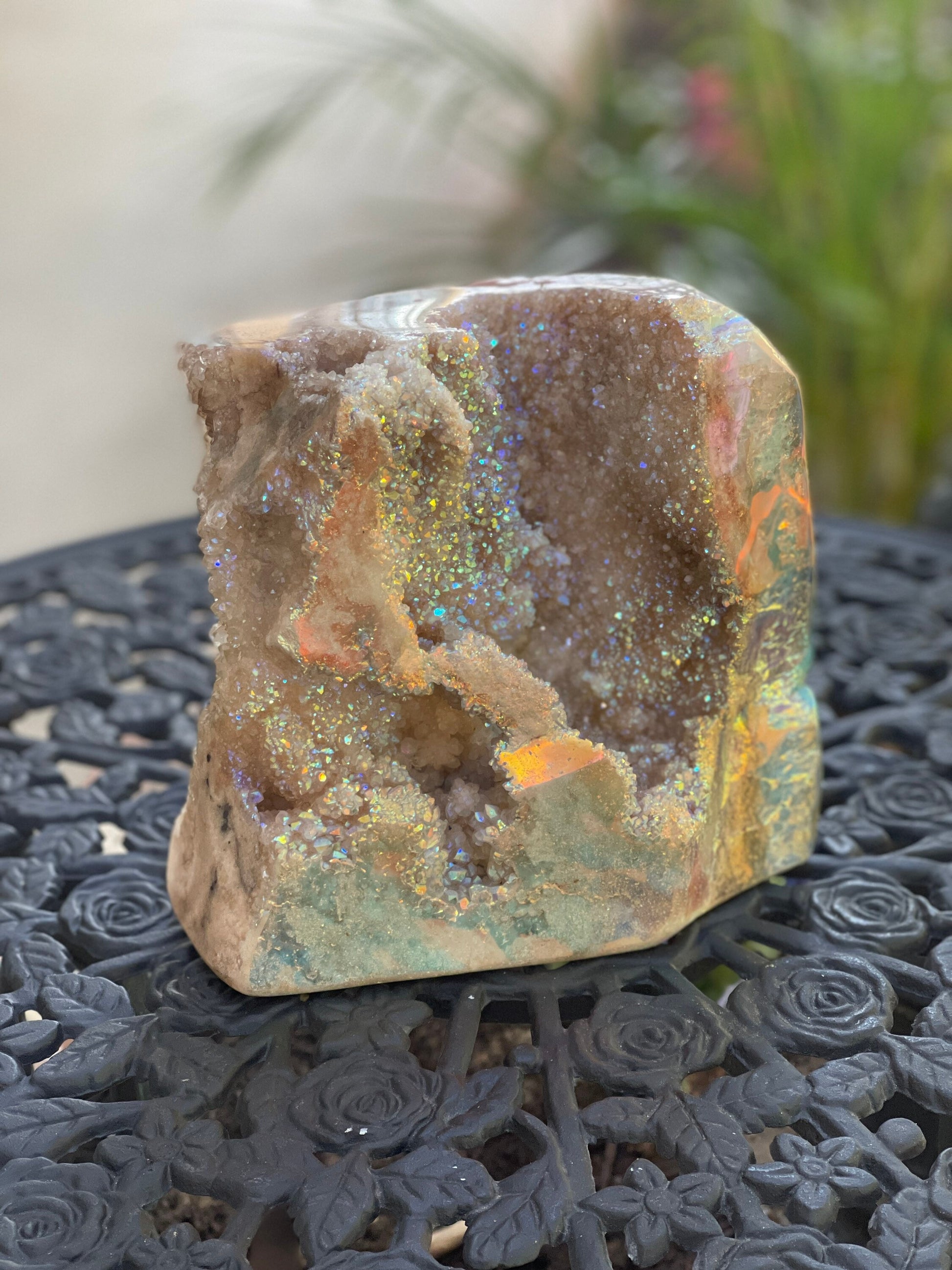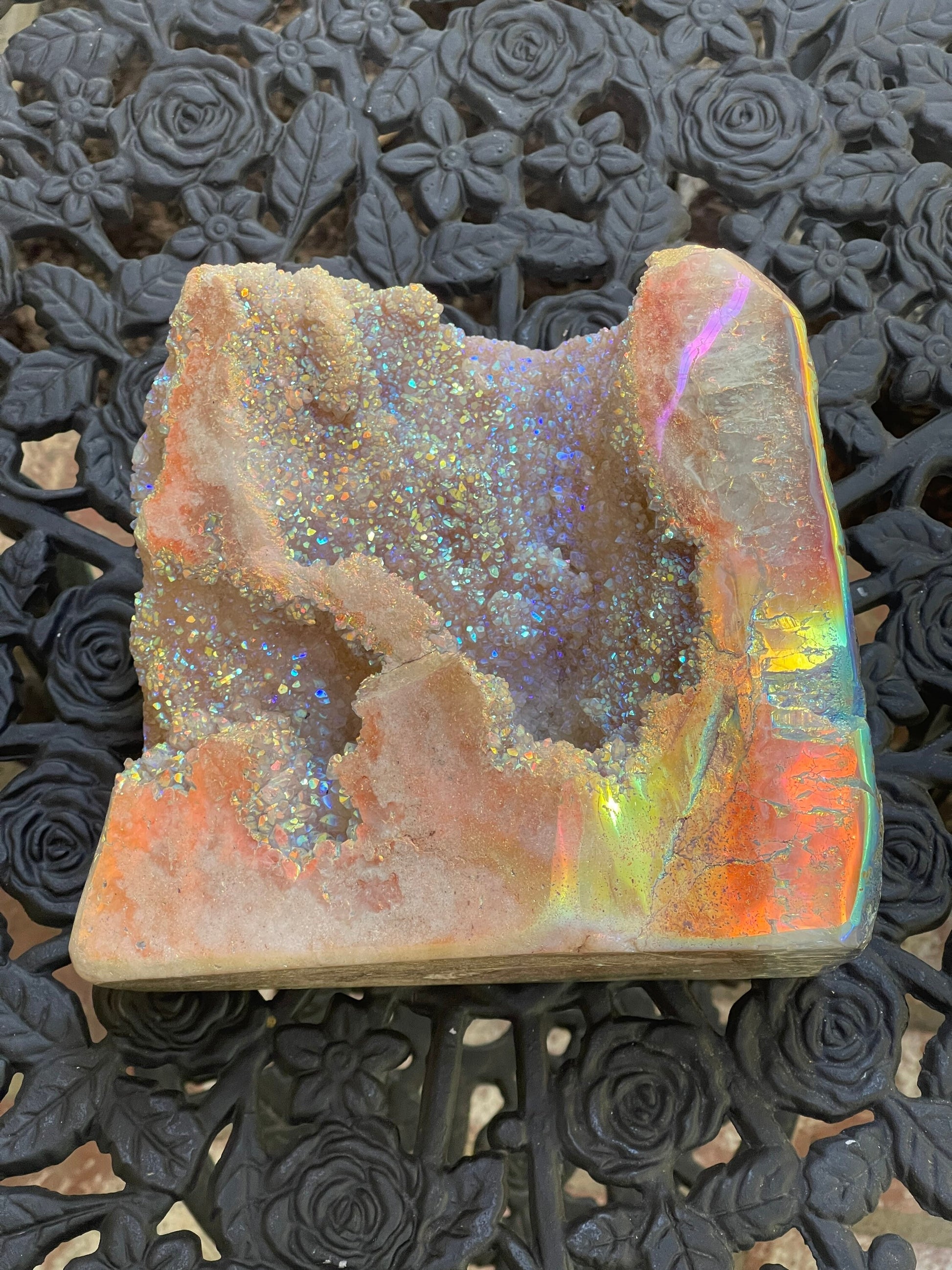 She is beautifully polished & has lovely formations as well as gorgeous color on the polished sides and back. Her beautiful crystals exhibit the most gorgeous iridescence.